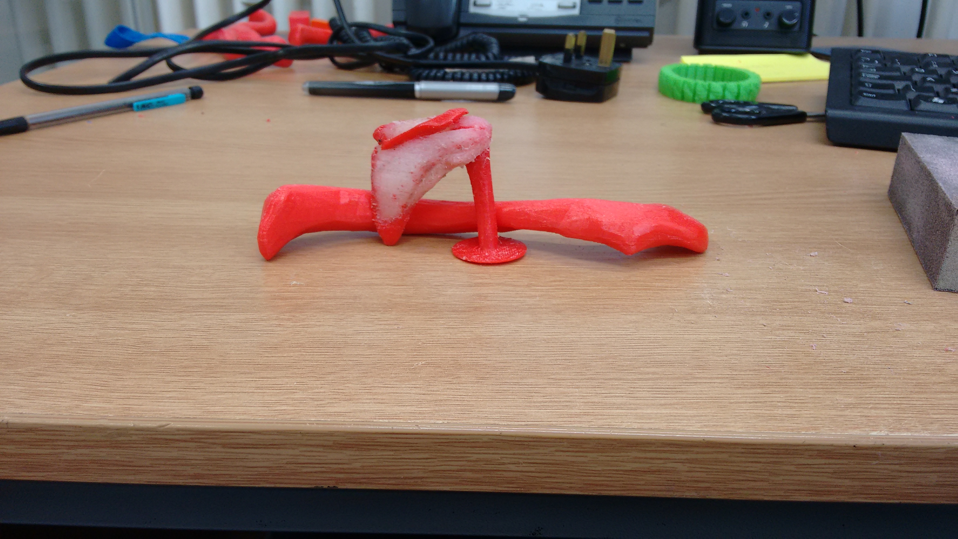 I have been experimenting with multi-material extrusion recently and current using a replicator 2x to do dual extrusions. Attached is a photo of my latest one of the rotor cuff joint in the shoulder and comprises of ABS and PU. I was wondering if there is anyway to differ the % infill for the different nozzles i.e. 100% infill on material 1 and 10% infill on material 2? I have experimented with custom profiles on makerware but I can't seem to find this option. Additionally we are developing our own printer capable of printing 4 materials at once so are open to all forms of suggestions with using different firmware and slicer options or even manually editing the G-Code.