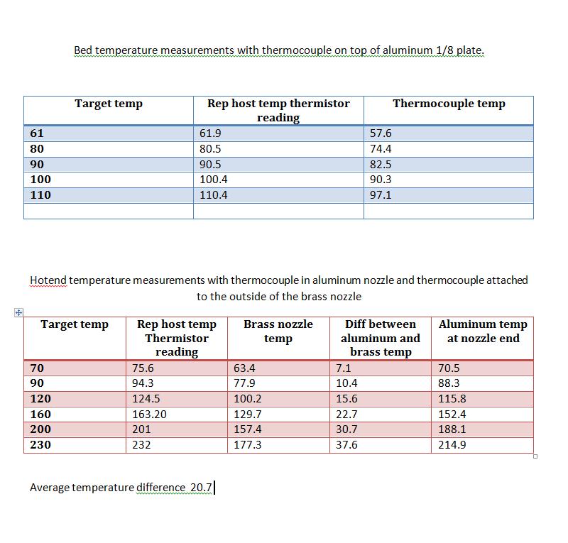 cambo3d wrote:Does the Aluminum temp at nozzle end is the bottom, top, or outside of the ring. I find it alarming to see the difference in those two measurments increase so much as temperature rises. Tells me either the thermocouple is having difficulty measuring the right temp or something is slowing hte transfer of heat between the alum and brass. How long did you let it soak for the measurments?
