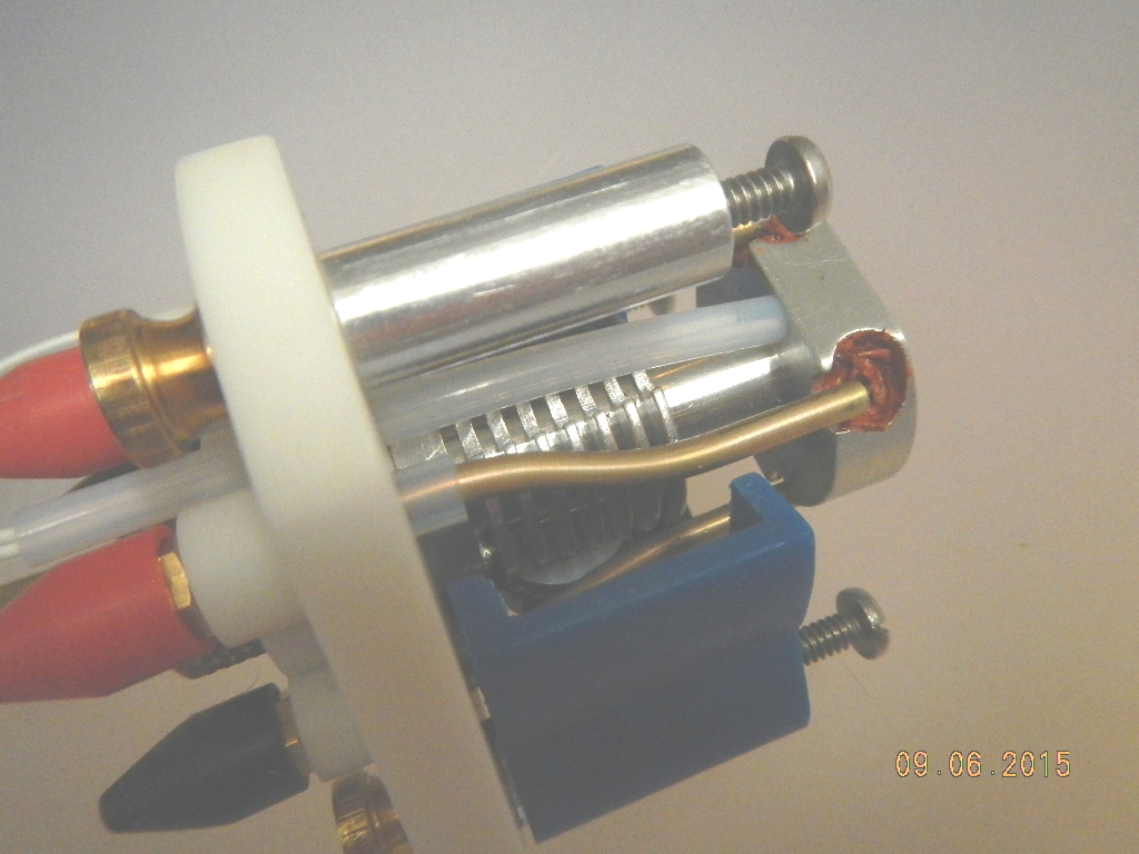 This is my version of a quick removal hotend, for repairs. Heaters are soldered into brass bus bars, and connected at top with set screw clamps. Two fans,tricklaser, and thermistor,have connectors,