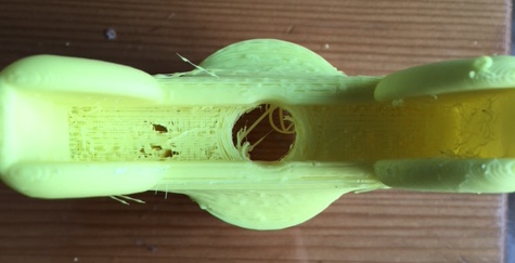 On the top view you can also see that the top solid layers inside the part have holes in them and are not at all good. On the part with the olive oil, they are solid. I still do have a bit of stringing, but these appear to be more solid strings like the extruder did not stop extruding, not like the classical spider web type of stringing which was abundant before the olive oil. On another failed part, the upper layers are crunchy and not well stuck together ( ABS @240 degs, and during the print it did not have a drop or similar problem).