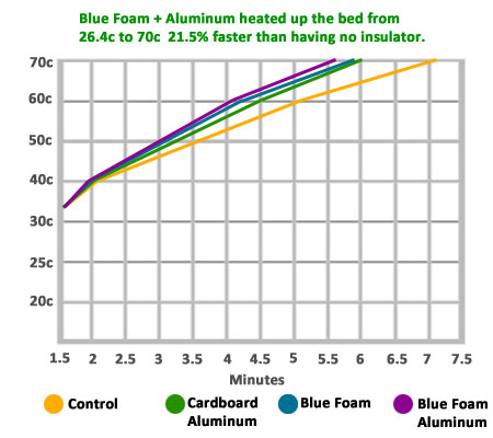 I've read numerous threads on upgrading your ATX power supply to 24v from the 12v to get your bed hot really fast. I don't want to go through all that effort. Not to say that I'm the first to think of this, which I seriously doubt I am, but I thought I'd put together a fairly comprehensive analysis of how to heat it up faster with very little effort. Below is a graph showing the research I did using a control (no insulator), cardboard covered in aluminum, blue foam, and then blue foam covered in aluminum. The verdict is in and the blue foam covered in aluminum heats up the bed 21.5% faster than without it. I did each test twice, using precisely the same base temperature of 26.4c to 70c. This took me roughly 7 hours to do each of the tests twice, including bathing the glass in ice water to get it to cool down faster. I hope someone finds this research valuable. From now on, I'm using the blue foam insulator with aluminum because it really does make a difference!