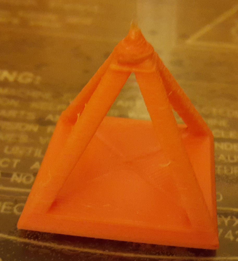 Here is the second attempt at the hollow pyramid. I reduced the retraction speed from the default 100mm/s to 40mm/s and kept the retraction length at 4mm. After the pyramid base was done, I turned on the fan at 30%. Still need some tweaking at the top which is still a glob of filament.