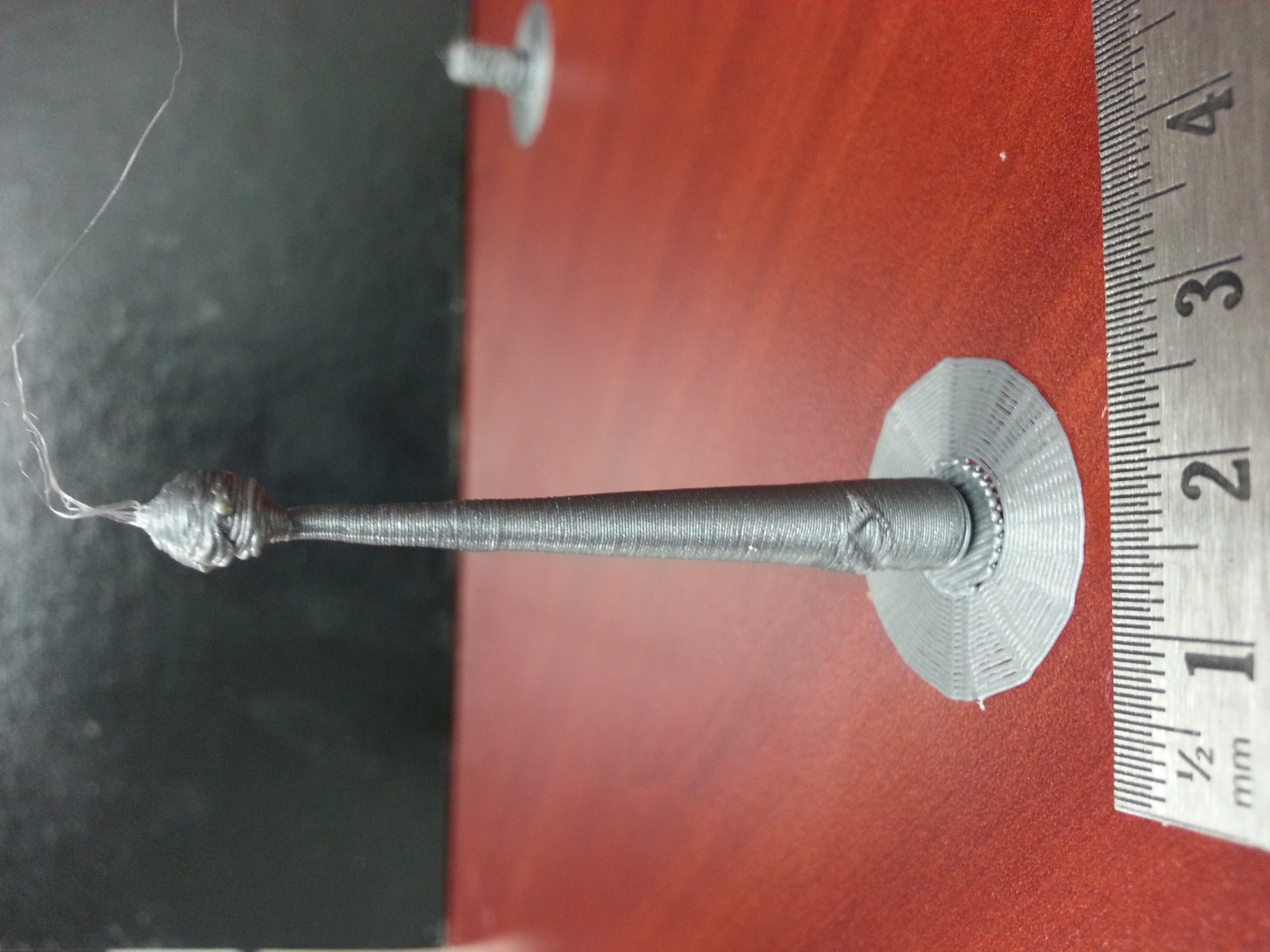 When I'm having difficulties finding the best settings for things I will often set them to extreme values to see what happens and adjust my way back something that works. So I set the flow rate to the minimum that Repetier Host will do (50%) and tried again. Photo 3 is the result. Better, but the ball is still bad. I likely will just cut the ball off and use as is.