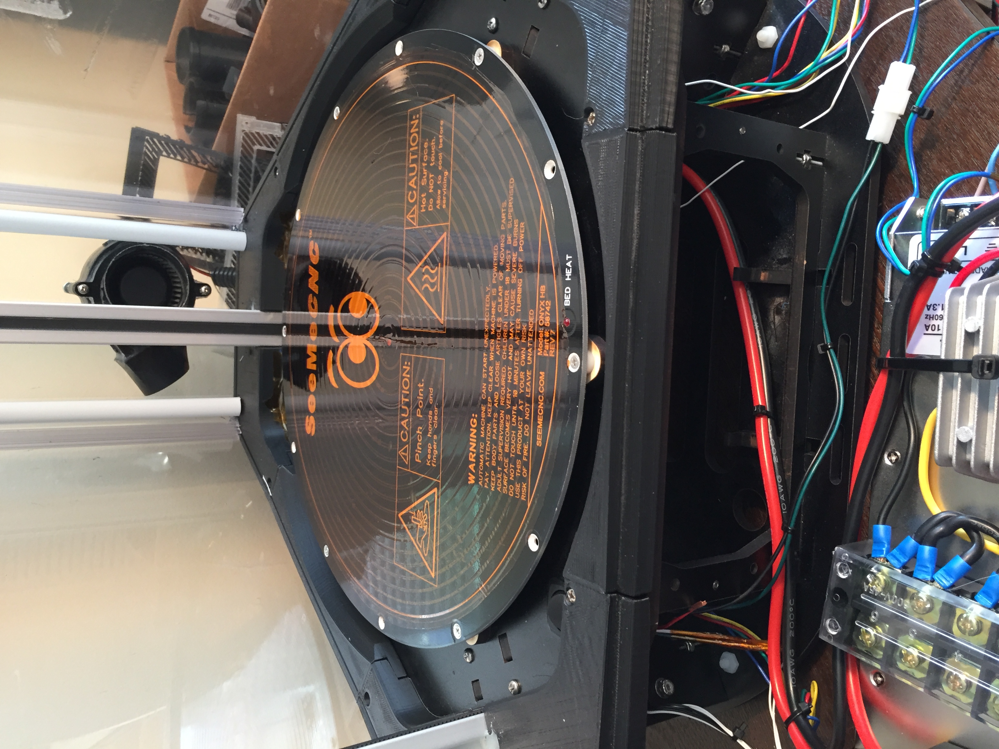 Up and running after installing a 24v power supply, SSR for the bed, Duet, Duex, trick laser platform, new SeeMeCNC carriages. Calibrated the bed manually at the three axis and center in concert with the horizontal radius (i.e. Delta radius). Prints awesome thus far!! Printing FSR pads and brackets now.