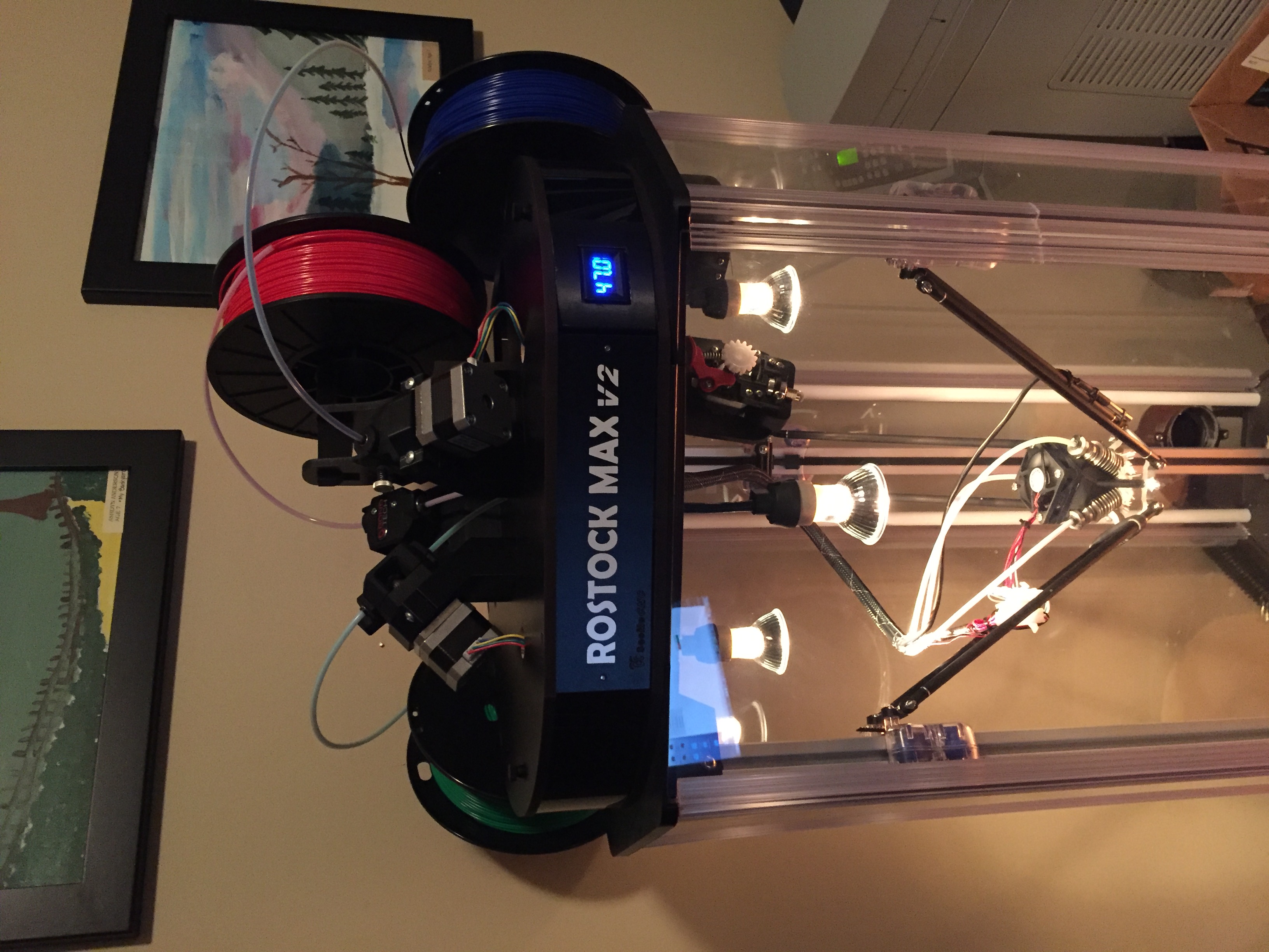 Up and running after installing a 24v power supply, SSR for the bed, Duet, Duex, trick laser platform, new SeeMeCNC carriages. Calibrated the bed manually at the three axis and center in concert with the horizontal radius (i.e. Delta radius). Prints awesome thus far!! Printing FSR pads and brackets now.