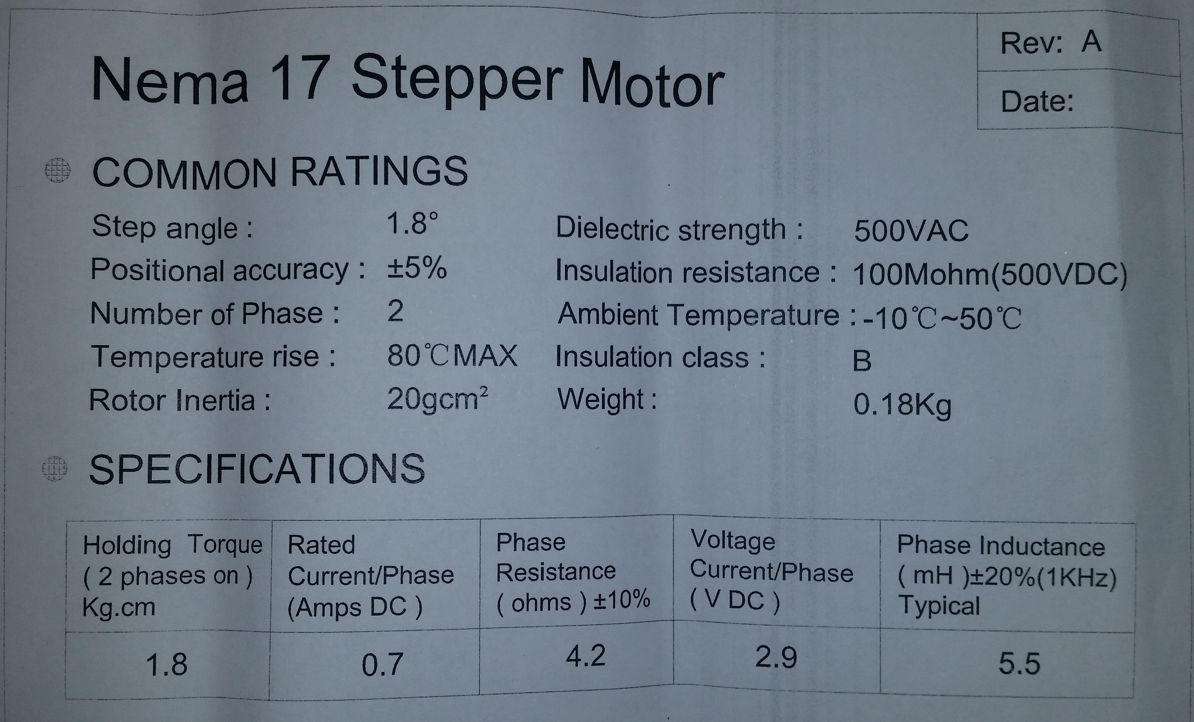 We DID change the stepper motor out from stock with a smaller one which we mounted directly to the titan which is setup as an air-struder. Of course, it came from China. As we do not know but enough to be dangerous about swapping steppers I thought I should post the specs here and see if we need to change anything in the firmware to get this one to work. Keep in mind that the printer was bone stock and worked just fine prior to the swap and the old stepper still works (we wired in QDs so my son could swap back if he wants while he is away at college).