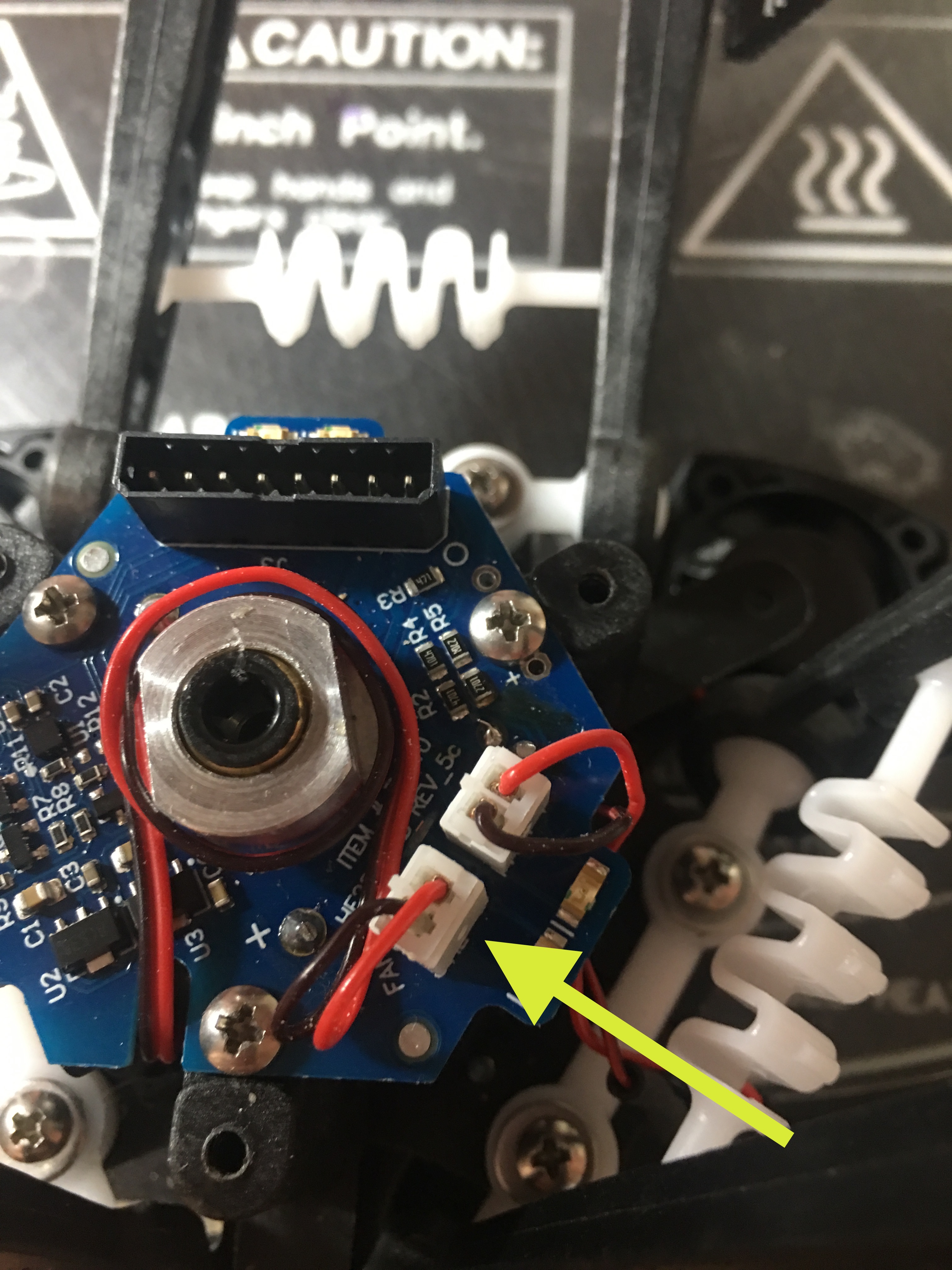 Now we are going to remove the connector and top cover from the HE280. Inside looks like this: The arrow points to the connector for the heatsink fan. Clip the black wire about 2" from the connector. Then strip and solder the other end to the new black wire. Make sure to put on a piece of heatshrink tubing before soldering. There will be a short (2") black wire hanging free off the connector, that's correct. I like to put a little piece of shrink tube over the end to insulate it. Now we are going to make the connection to RAMBo. The new black wire inserts into the connector like this: The connector fits into the top edge of the RAMBo at the position marked Heat 1 - NOT Fan 1, like this: That's it! Before buttoning everything up, test to make sure the fan comes on at 40°. You will need to plug in the HE280 connector and then turn on the printer. Then set the hotend temperature (LCD display is easiest) to 150°C (the minimum it lets you set). Watch and listen. If the fan comes on at 40° turn the hot end off and turn off the printer.