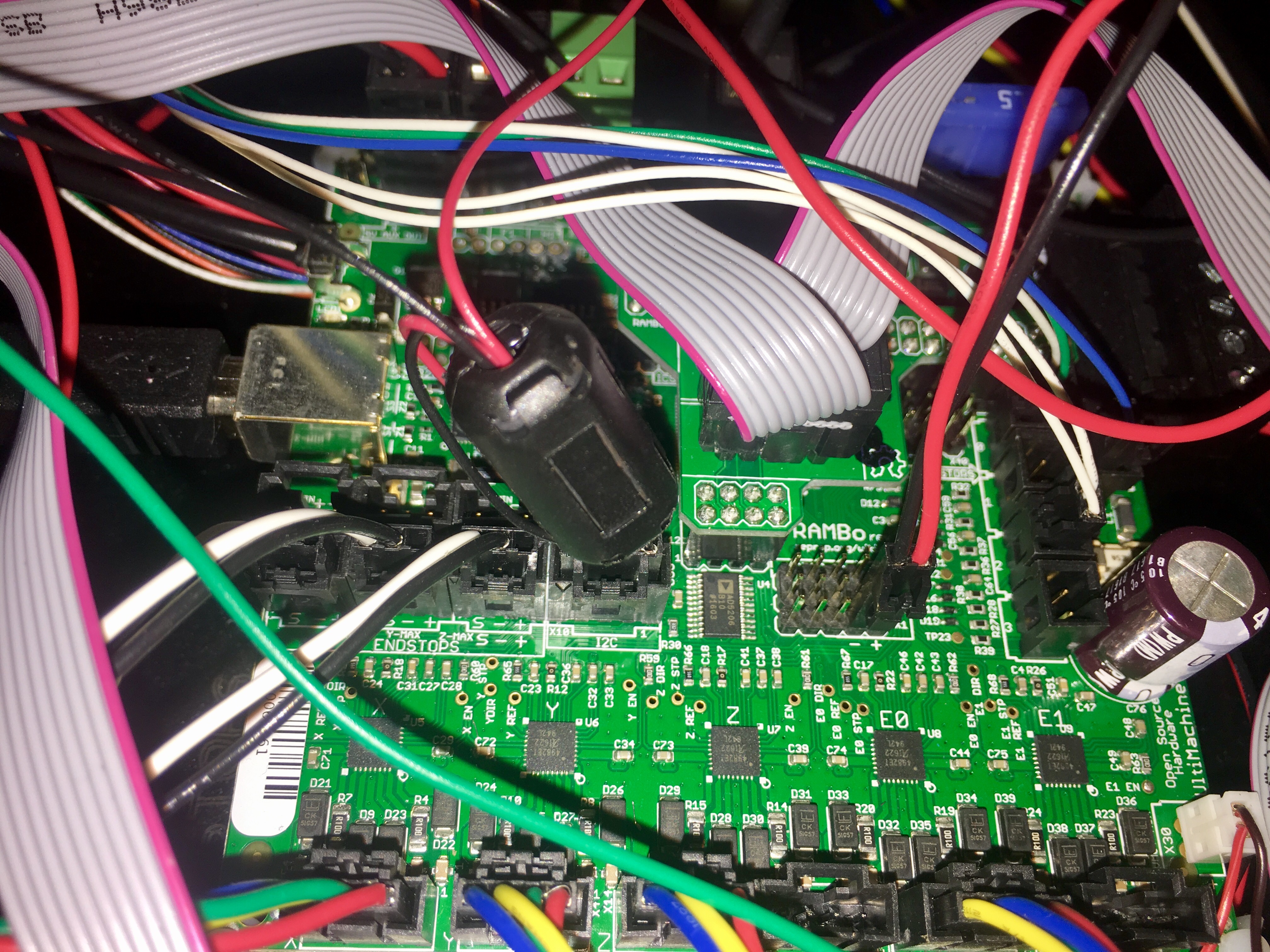 I would like to note that in our testing just adding a bead around the signalling wires leading to the rambo made a difference in probing. Adding the second bead at the hotend made it work.