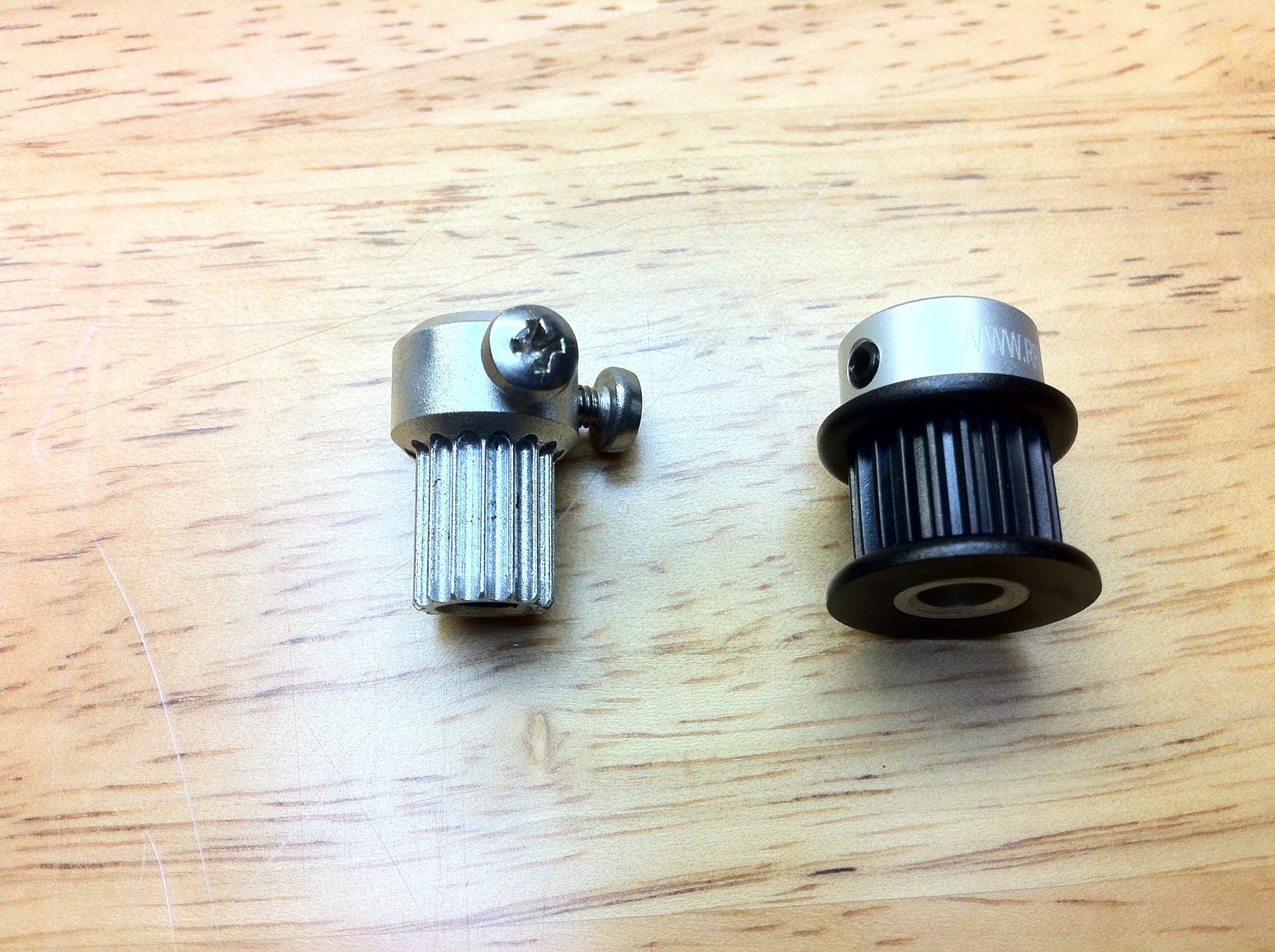 Here's a picture of a new 20-tooth pulley next to a 15-tooth pulley. The old pulley has half-round valleys between the peaks like I'd expect, but the new one has flat-bottom valleys, flat-top peaks, and flat sides on the teeth. Doesn't seem quite like it fits the belt profile, but it claims to be GT2. The pulleys are from RepRapDiscount, apparently, from the URL on the pulleys.
