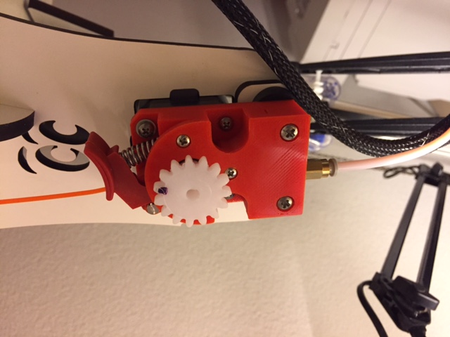 Just wanted to share the Extruder modification of my stock extruder on the Rostock MAx V2 when printing with flexible filaments like Polyflex: After jamming the filament indside the hobbed wheel - I've printed this modification on from Thingiverse.