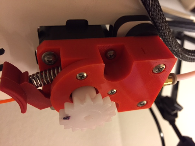 Just wanted to share the Extruder modification of my stock extruder on the Rostock MAx V2 when printing with flexible filaments like Polyflex: After jamming the filament indside the hobbed wheel - I've printed this modification on from Thingiverse.
