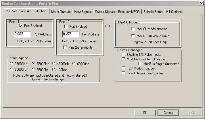 You do need to setup the A drive as shown. Also Dir LowActive as shown. Ports look fine, pin configs are correct. I am not sure about the Enables as I'm running the 4 axis board. Maybe someone can pipe in with their Enables pin #s.