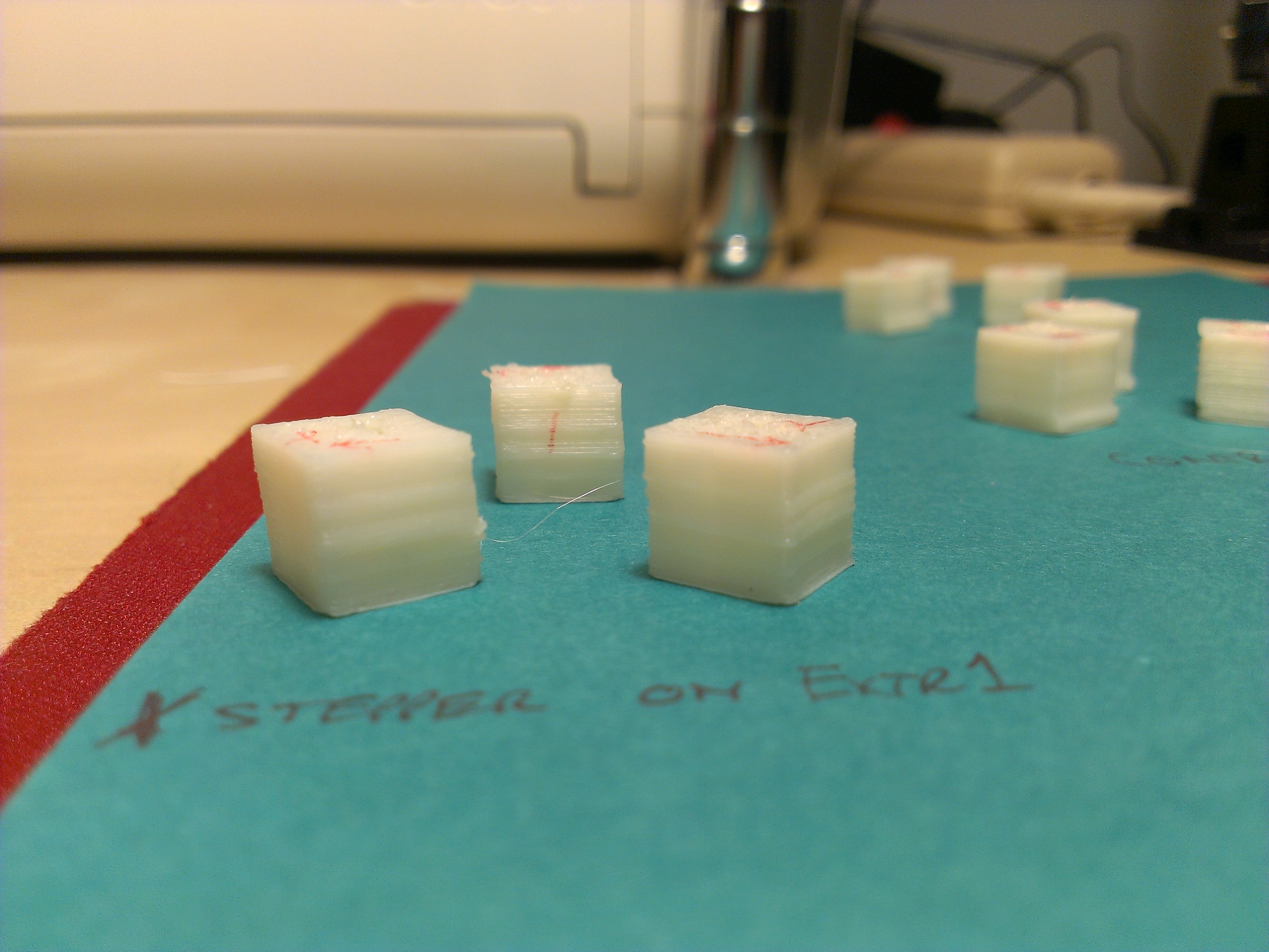 So here's the results of the pin swap extravaganza. In openscad, I created another test pattern so I could better see differences between each change. It's just three 10mm cubes arranged in an equilateral triangle, with faces facing each tower.