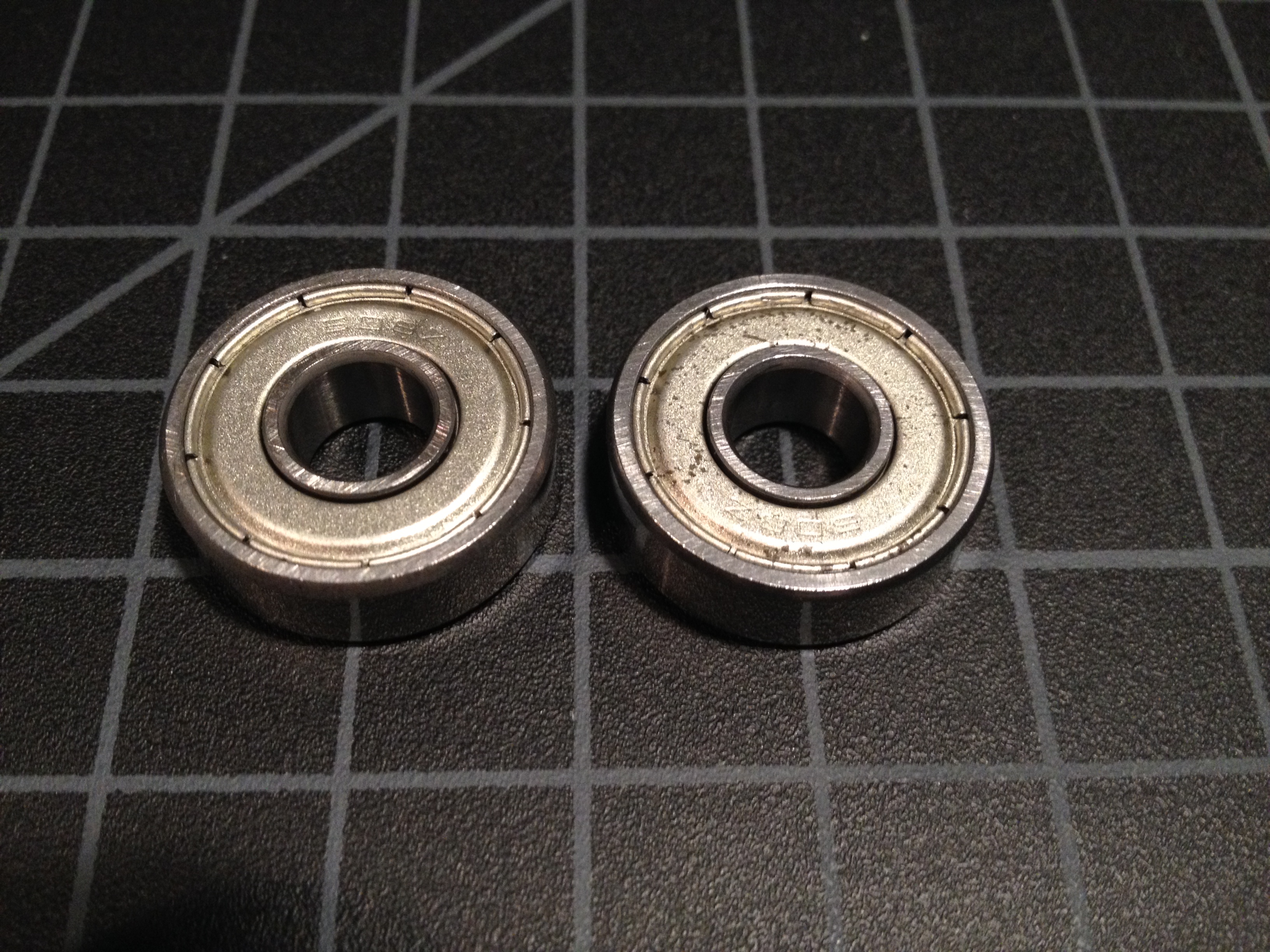 One had a slightly collapsed cover, and the other was obviously contaminated with some kinda solvent/chemical. Both felt a little rough when spun. I might have still used them as the tensioner pulleys had I not had a couple spare 608ZZ laying around.