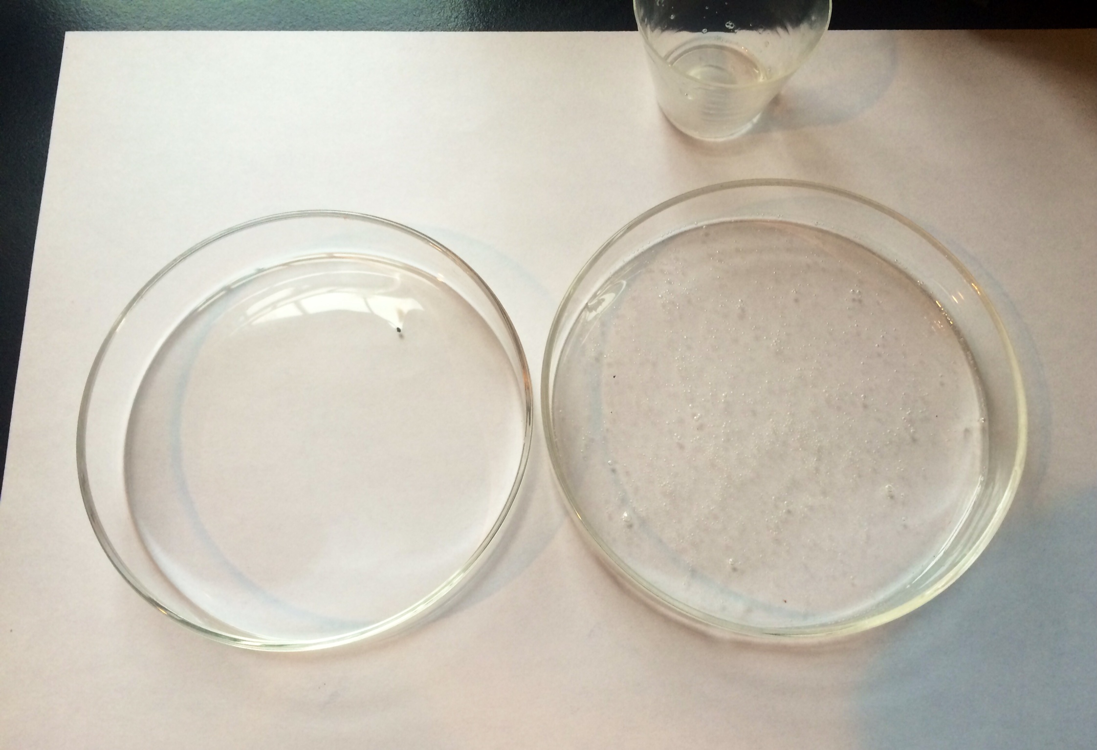 Then I poured it into a clean glass petri dish. I used isopropanol to clean all traces of grease off. I pushed the mixture around to form a nice 2-3mm thick layer.