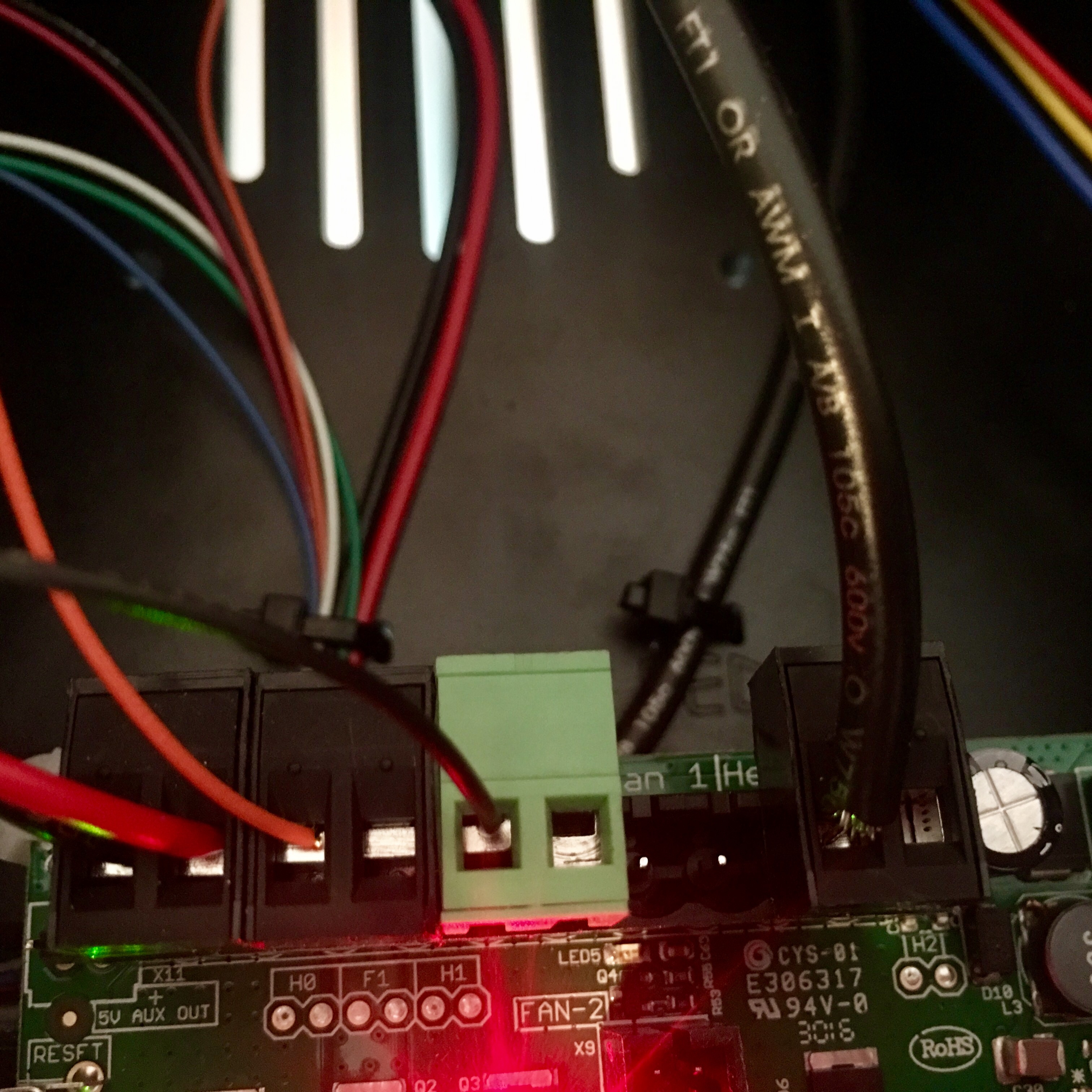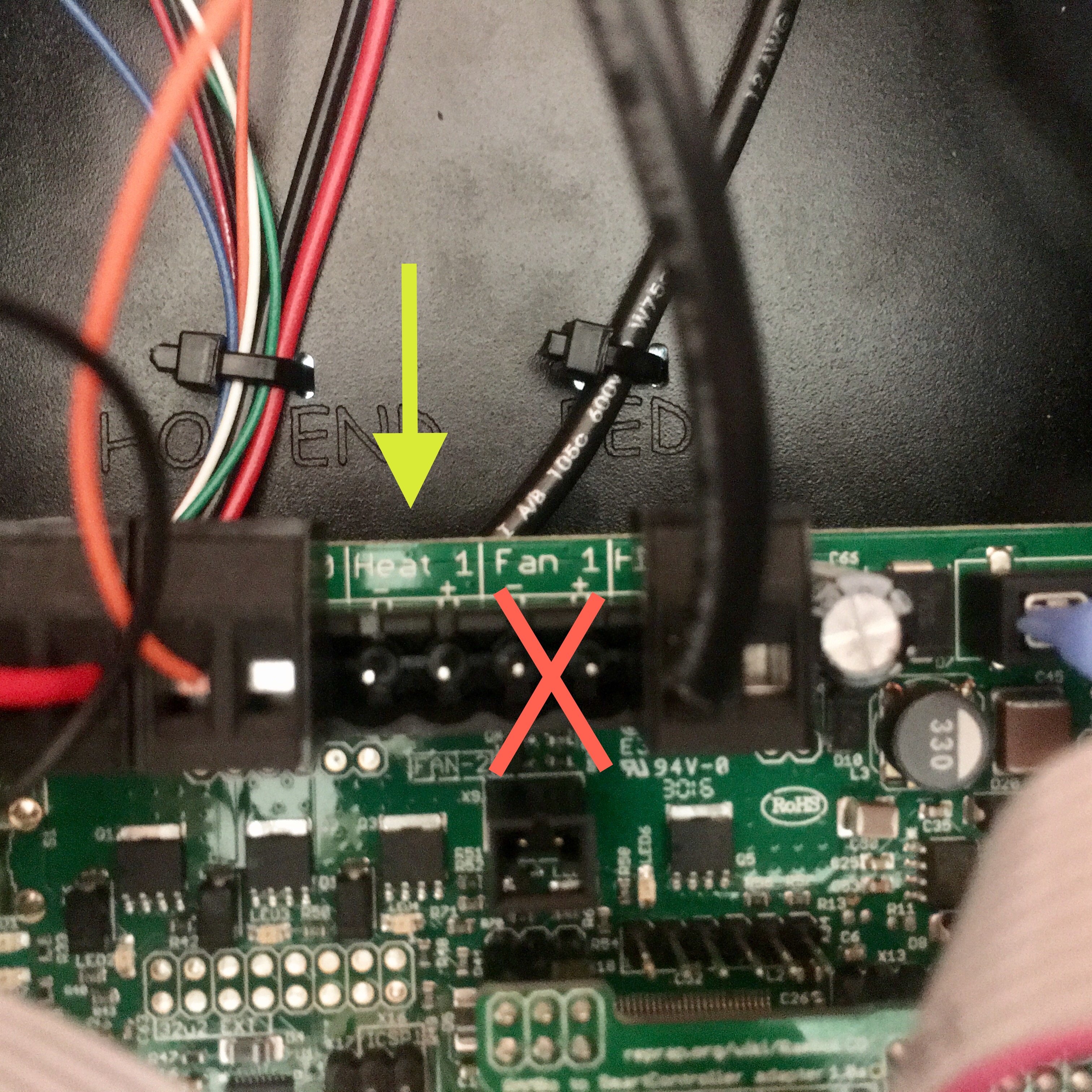 Now we are going to remove the connector and top cover from the HE280. Inside looks like this: The arrow points to the connector for the heatsink fan. Clip the black wire about 2" from the connector. Then strip and solder the other end to the new black wire. Make sure to put on a piece of heatshrink tubing before soldering. There will be a short (2") black wire hanging free off the connector, that's correct. I like to put a little piece of shrink tube over the end to insulate it. Now we are going to make the connection to RAMBo. The new black wire inserts into the connector like this: The connector fits into the top edge of the RAMBo at the position marked Heat 1 - NOT Fan 1, like this: That's it! Before buttoning everything up, test to make sure the fan comes on at 40°. You will need to plug in the HE280 connector and then turn on the printer. Then set the hotend temperature (LCD display is easiest) to 150°C (the minimum it lets you set). Watch and listen. If the fan comes on at 40° turn the hot end off and turn off the printer.