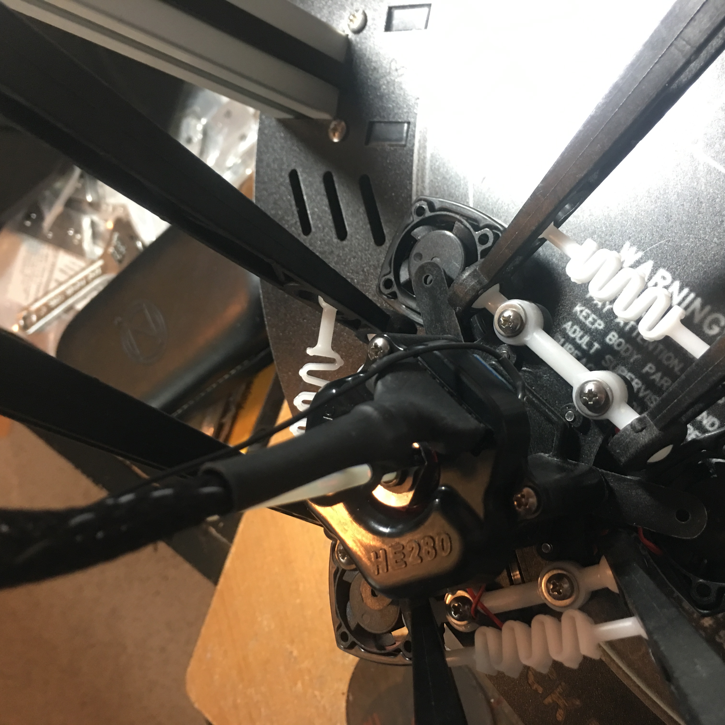 Disconnect the Bowden from both the extruder and hotend. Don't loose the little lobster claws! Now pass the 4' of wire INSIDE the Bowden from the extruder end until it comes out the bottom. Grab the wire at the top and then pull the Bowden out of the whip sleeve from the bottom near the hot end. Yes, you are removing the Bowden from the sleeve. This is all to make sure the thin black wire is inside the whip sleeve. If you come up with an easier way, chime in! Once the Bowden is removed, you have to put it back in exactly the way it came out (except without the wire inside it!). When you are done, you'll have the wire and Bowden inside the whip with the wire coming out of the side of the sleeve at the top like this: Next, unscrew the bulkhead connector that the sleeve and wires run through in the top plate. Also remove the top access plate. You need to loosen it all the way in order to get the wire through the fitting. Carefully find where the wire comes through the sleeve braid and push the end back through the same opening and up towards the top. The idea is you want to get this last foot or so of wire inside the sleeve, through the fitting and out of the end of the sleeve in the top. It is much harder to describe than it is to do! Once the free end is visible in the top, grab it and pull out some of the slack but make sure NOT to pull the lower end up into to the sleeve.