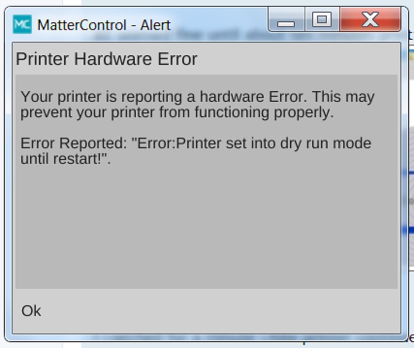 All seemed fine until about ten minutes printing when the window popped up (see picture for screenshot).