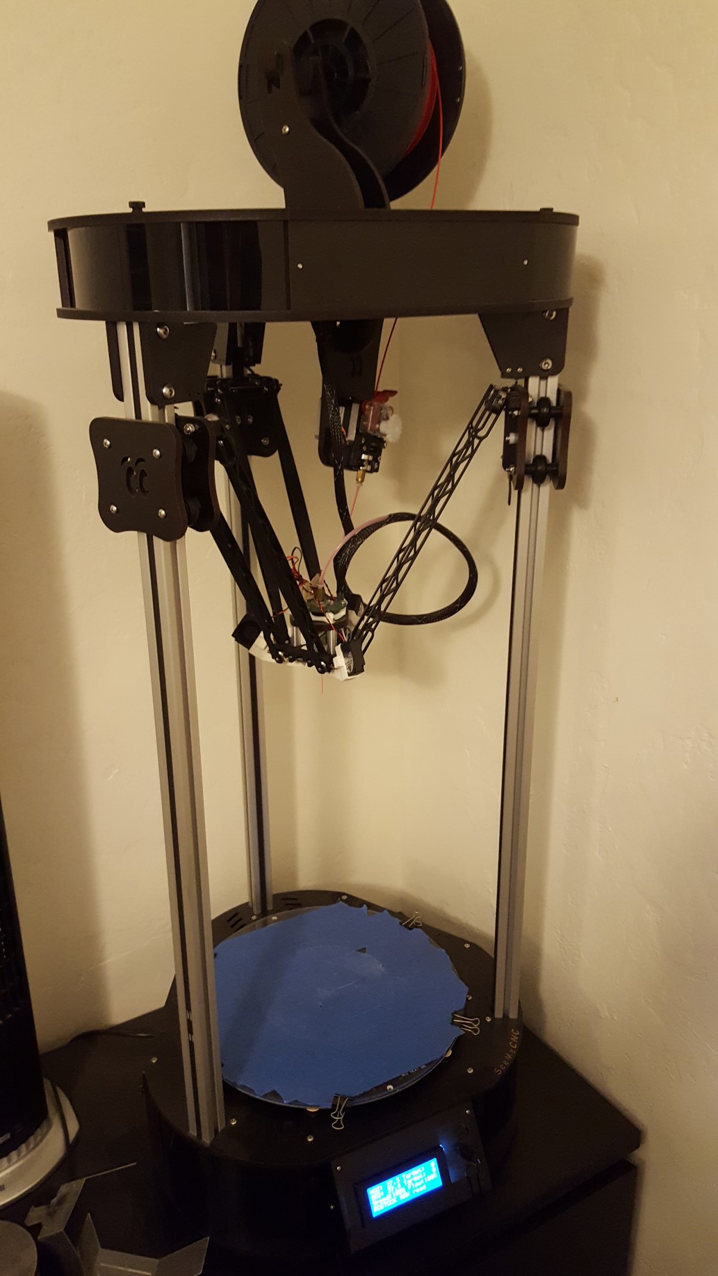 It's a Rostock Max V2, purchased June 2014. I have upgraded the stock power supply with a Corsair CX750M modular power supply. I have to say, that upgrade was not as straight forward as I would have hoped but it did make a huge difference in maintaining the nozzle temperature when the fans kick on. I have also installed two additional part cooling fans on the head. The total time printing reads 20 days and 6 hours; filament used is 4280.1 Meters.