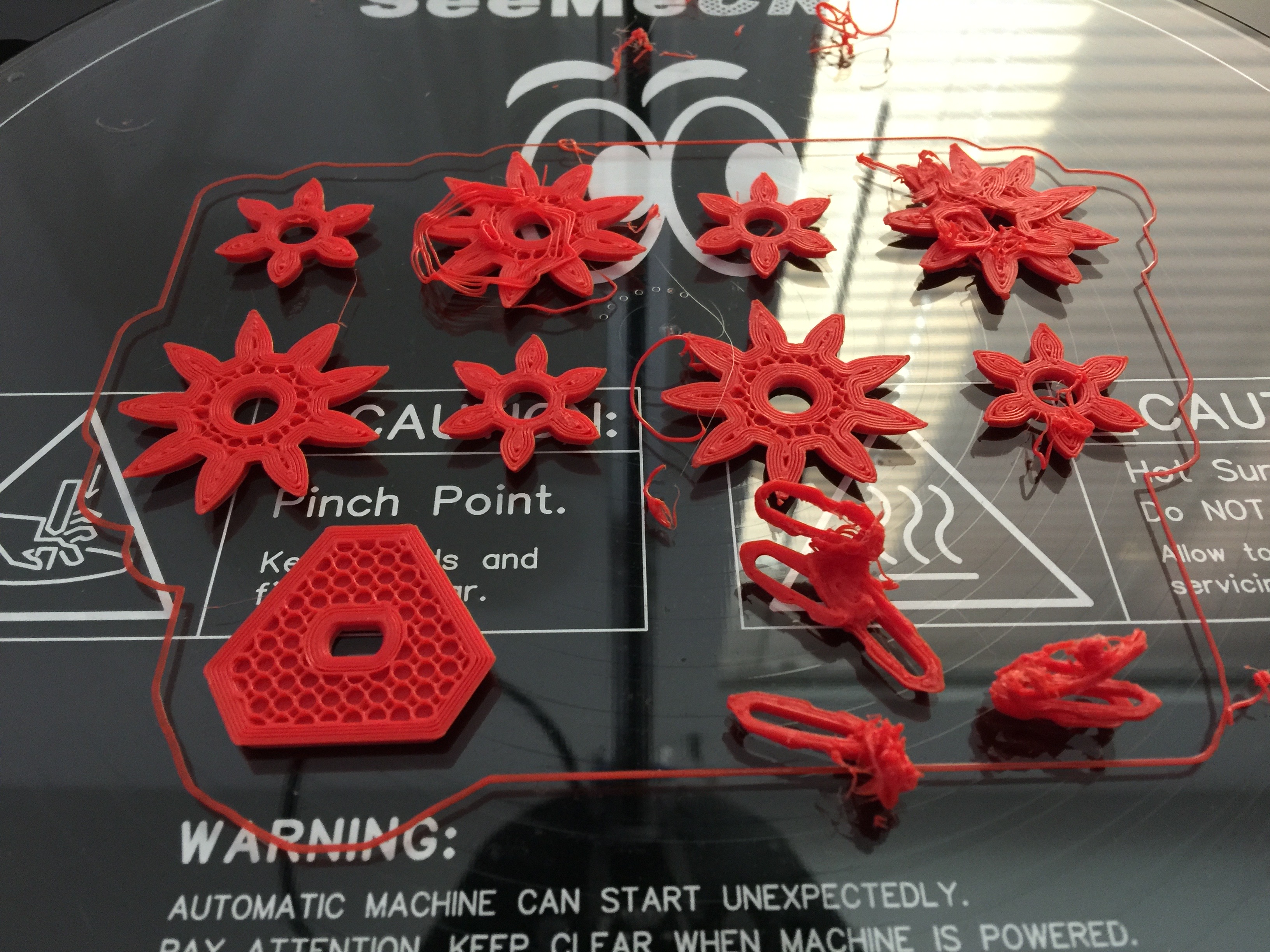 I've been printing on bare glass with no problems up till now, but I guess it's time to look at installing that FabLam I bought. I was printing a geared cube from Thingiverse (http://www.thingiverse.com/thing:213946/#files). The individual gears and center-piece were all still adhered, so my guess is that one or more of the small pins in the lower right let loose from the bed and then it was off to the races. Too bad as I started the print and watched the first 4-5 layers go down before heading to bed. This couldn't have happened more than 10 minutes after I left the room...
