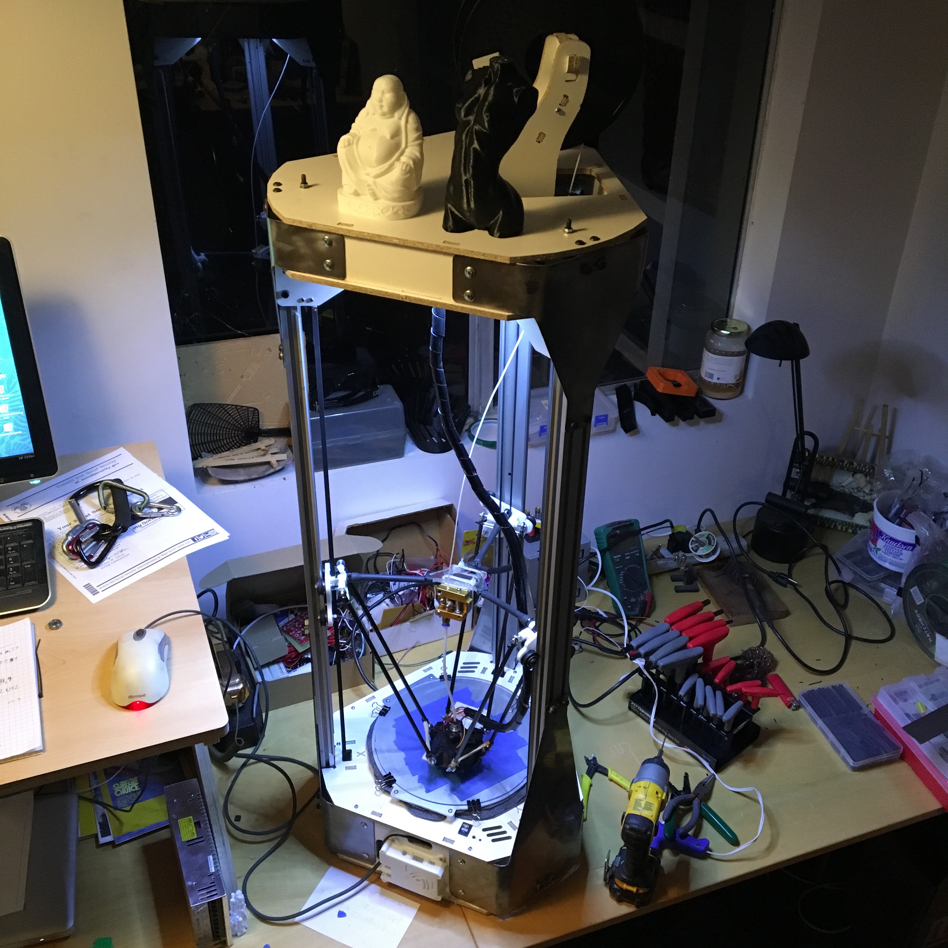 Over the Xmas break I was able to do a few upgrades to the machine. Im calling this version the "White Knight". I designed new slides for the makerslides and recut the base and top with new white melamine. I used cnc plasma to cut the side supports and this version is super stiff now. With the new slides I changed the belts from going around the alumnium to the Kossel style. Aslo the LEDs are a nice touch.