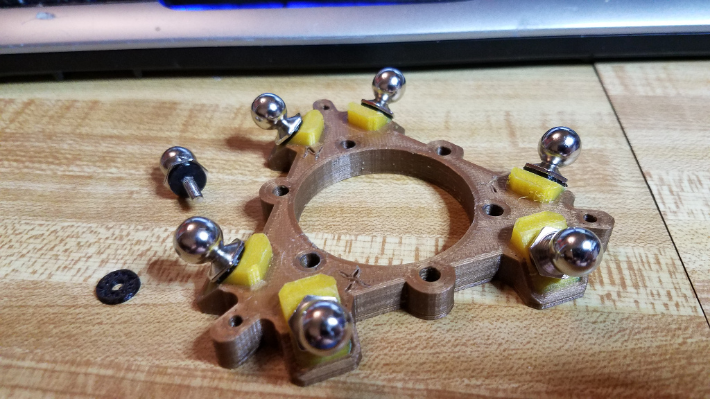 I've been working on improving my printable magnetic arm effector. One of the issues I've identified is that it's difficult to get the ball joints, which screw into captive locknuts inside the effector, to be perfectly level. PLA and PETG will only compress a tiny amount (a few microns) before they break. I was unable to find any 10x3x1mm washers on Amazon or McMaster-Carr, so I turned to thermoplastic polyurethane (TPU). At first, I tried printing a 100% solid washer, but that didn't compress much either. After experimenting with settings for awhile, I figured out that the inside needed to be as hollow as possible.