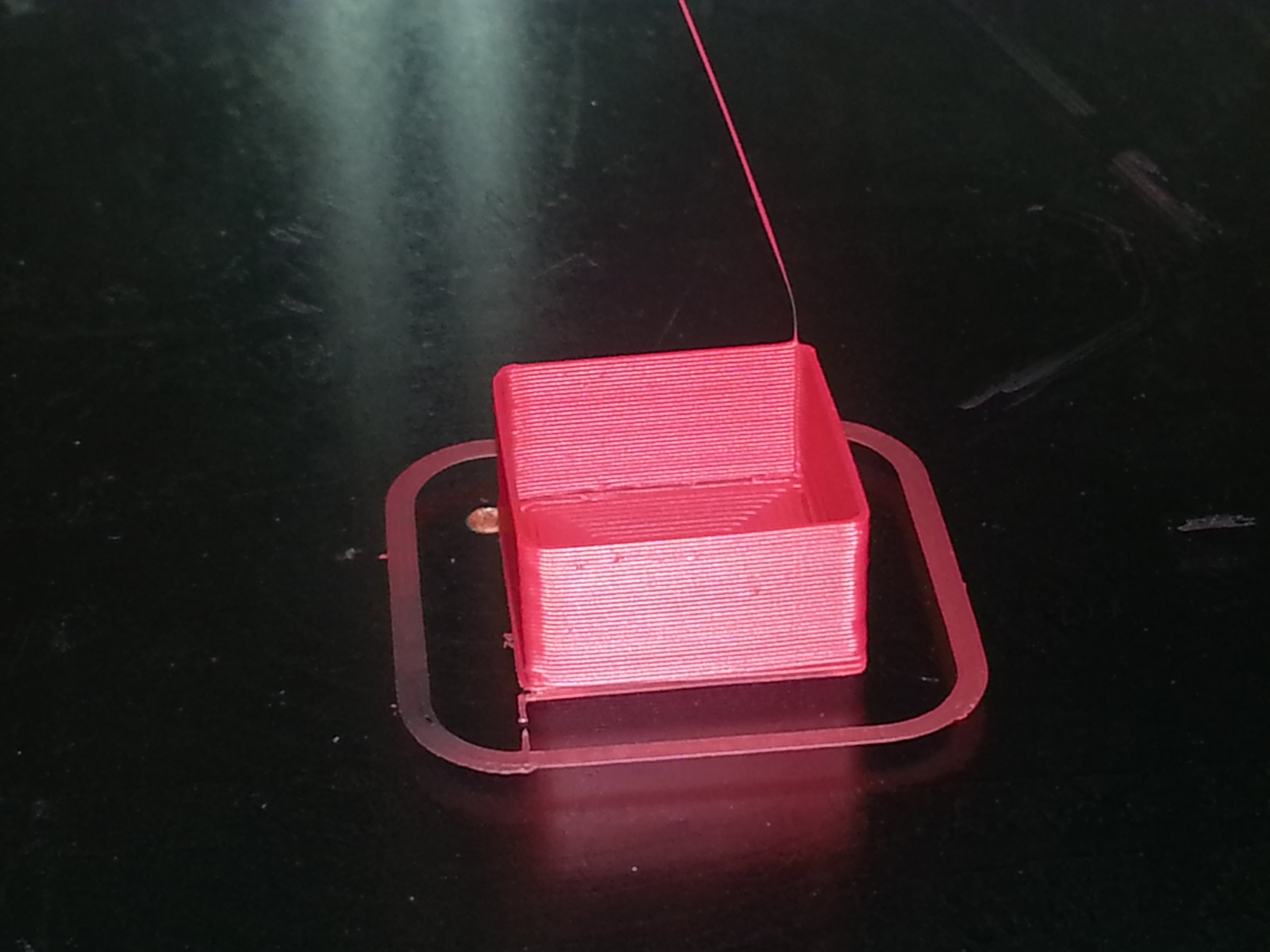 At this point I'd normally take 0.55/0.65 = 0.85 and just use it as the extrusion multiplier, print another hollow cube, verify then print a solid cube, but I want to show you how extrusion affects print quality.