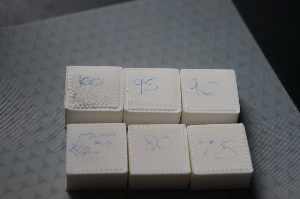 What's not obvious is the general effect it has on other aspects of quality here is the profile of the 100 85 and 75% cubes. Note the unevenness and generally poor layer alignment of the 100% cube, it's worse in Slic3r than most other slicers because Slic3r only prints perimeters inside to out, pretty much guaranteeing that the outside perimeter is displaced by extra material in the inside perimeter.