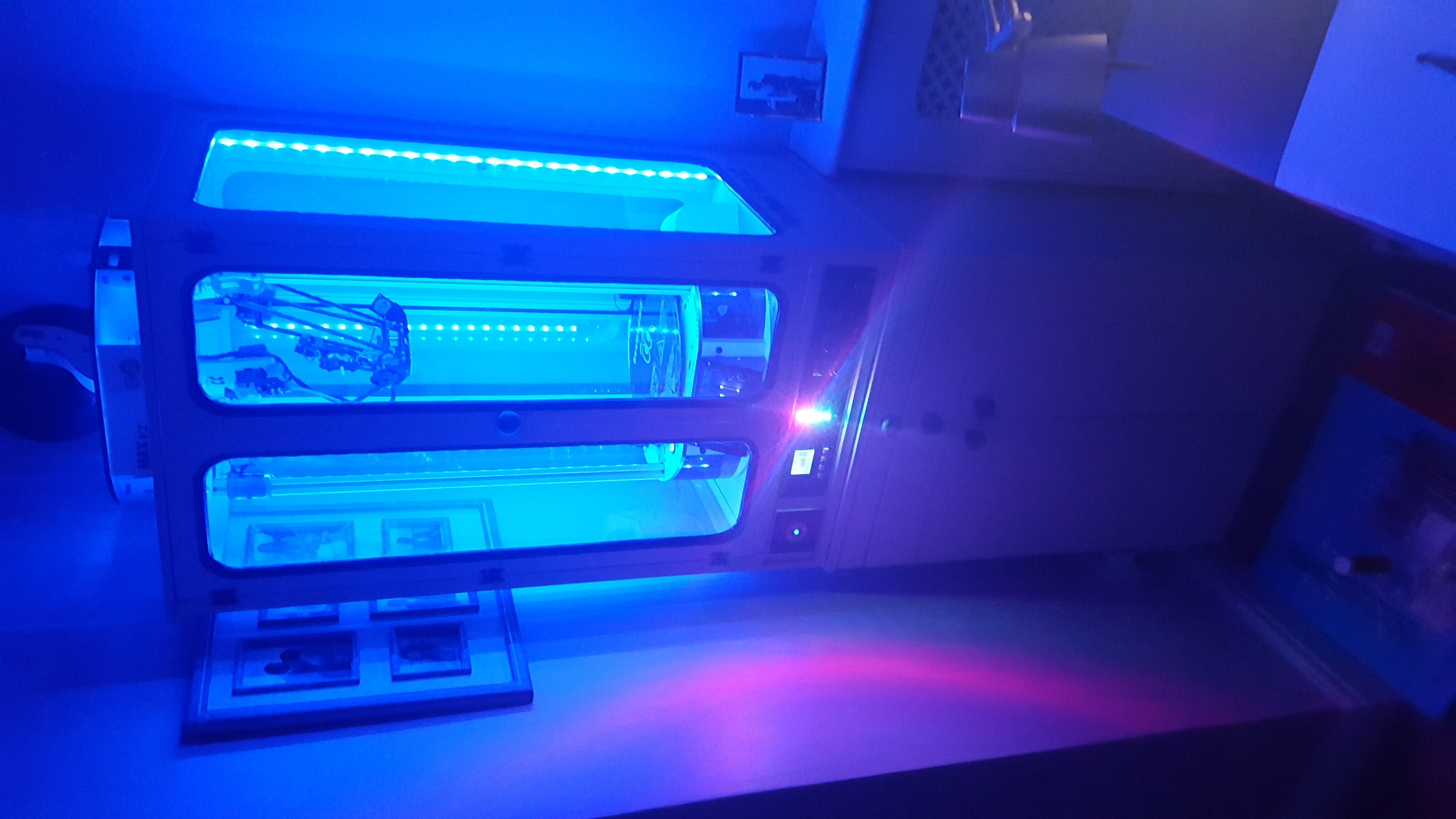 Also a custom Arduino driven Adafruit 24 RGB Led ring mounted under the hot end. This monitors the chassis RGB leds and copies their colour. I usually have it set to white to help with monitoring the print.