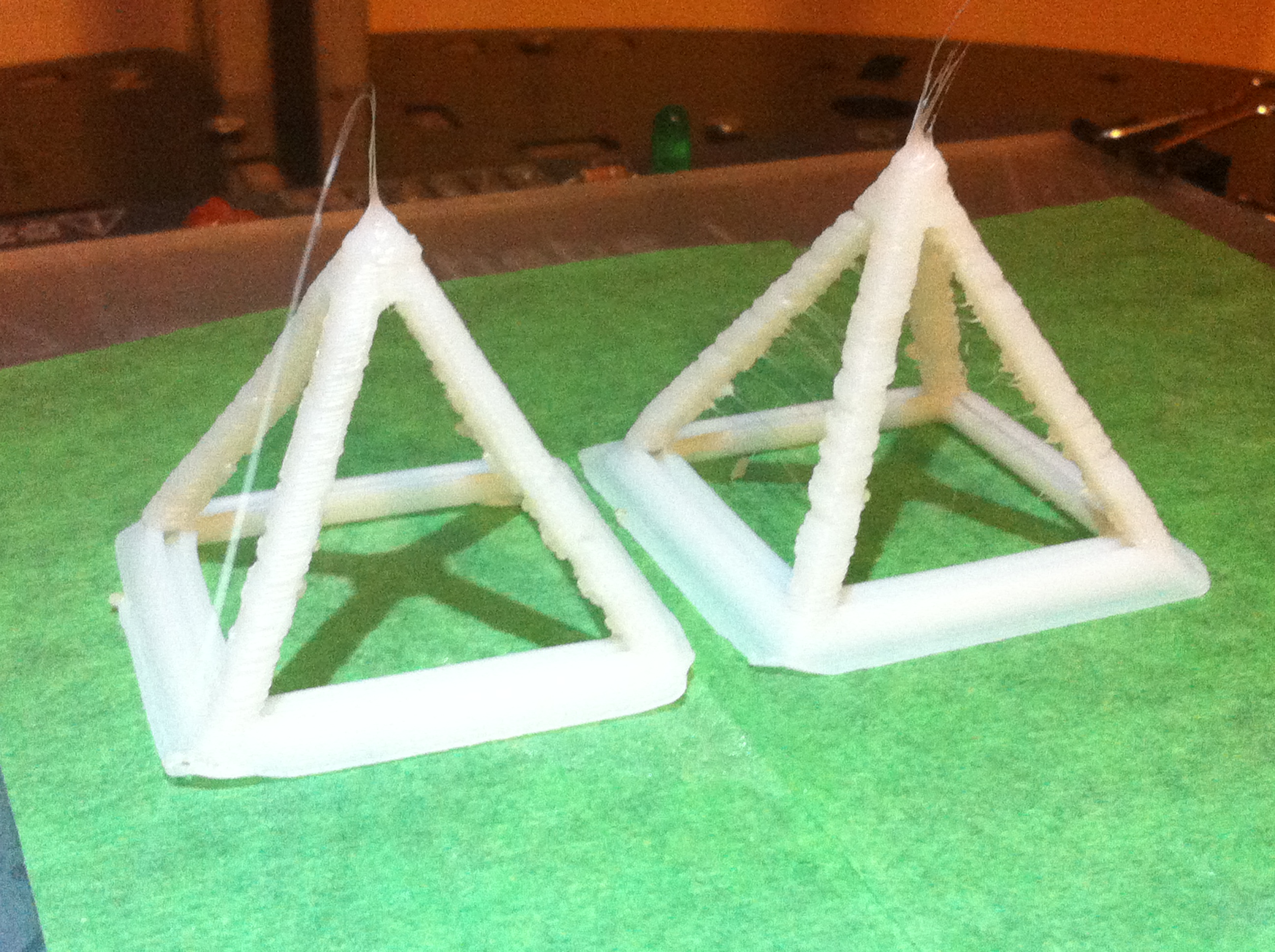 Hi,Polygonhell wrote:I've printed this thing on 3 different printers and I've never been able to match the quality in that first picture, I can't cool the struts fast enough tha they don't get pushed around, and I can't get a clean point on top, I'd be interested in what settings and what hot end was used for the pyramid in the first picture.