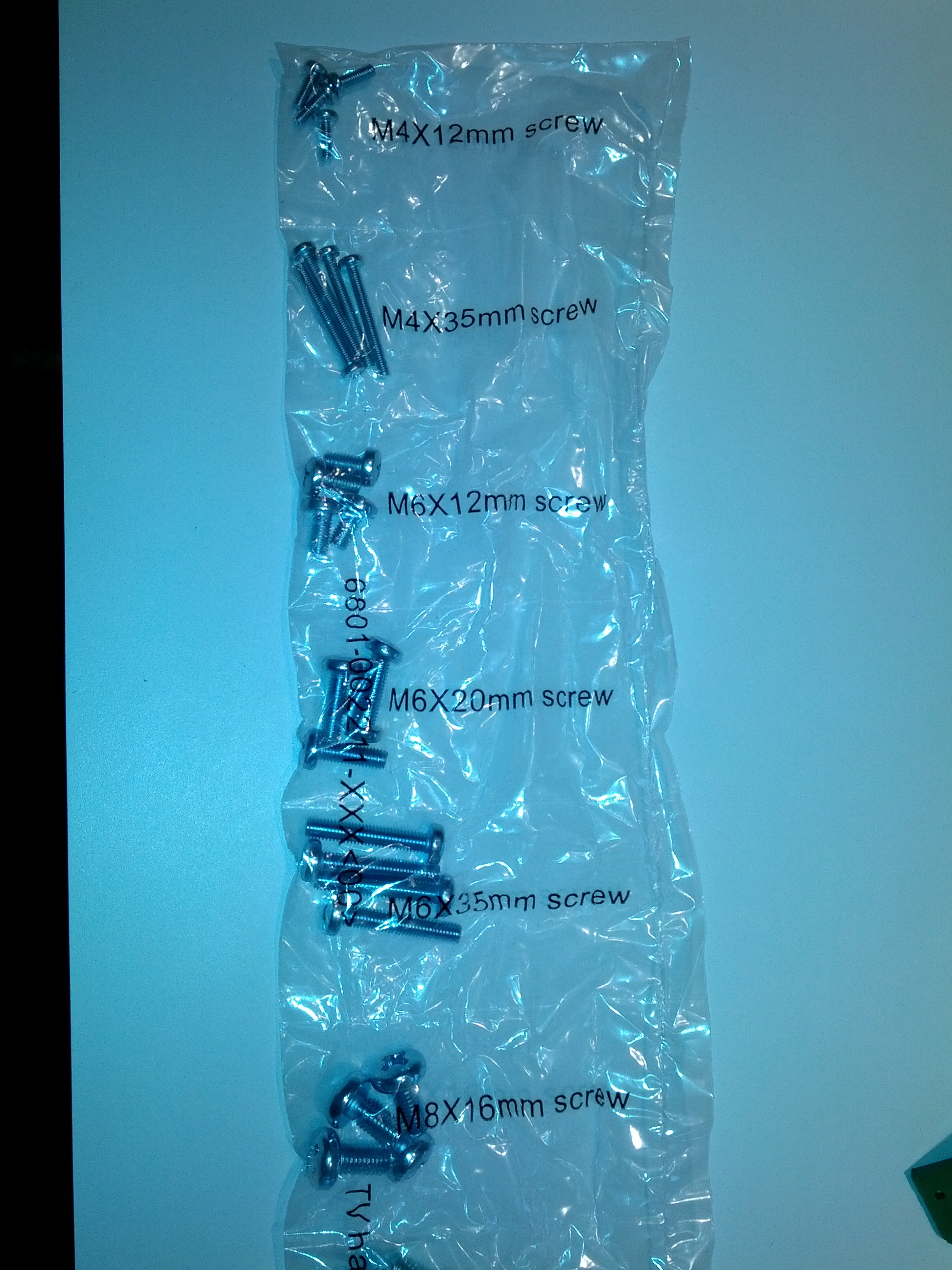 SeeMeCNC published some very nice photos to help us identify the fasteners and other parts. They're a little old and basically match the Kickstarter verison of the kit (I think), but I found them still useful for my May, 2013 kit.