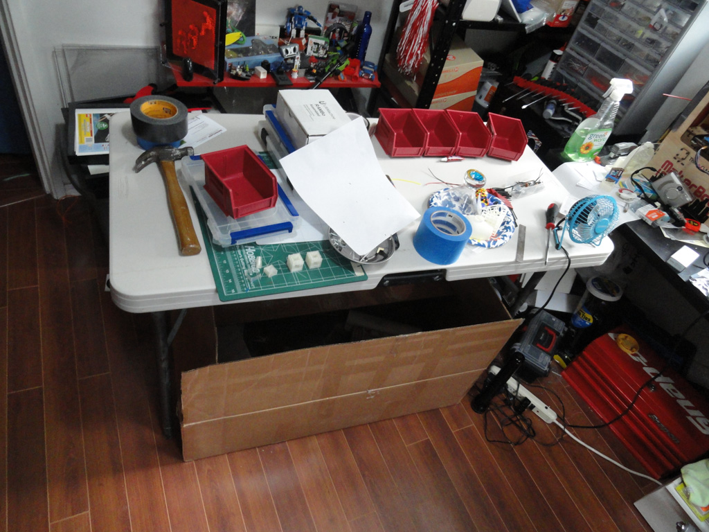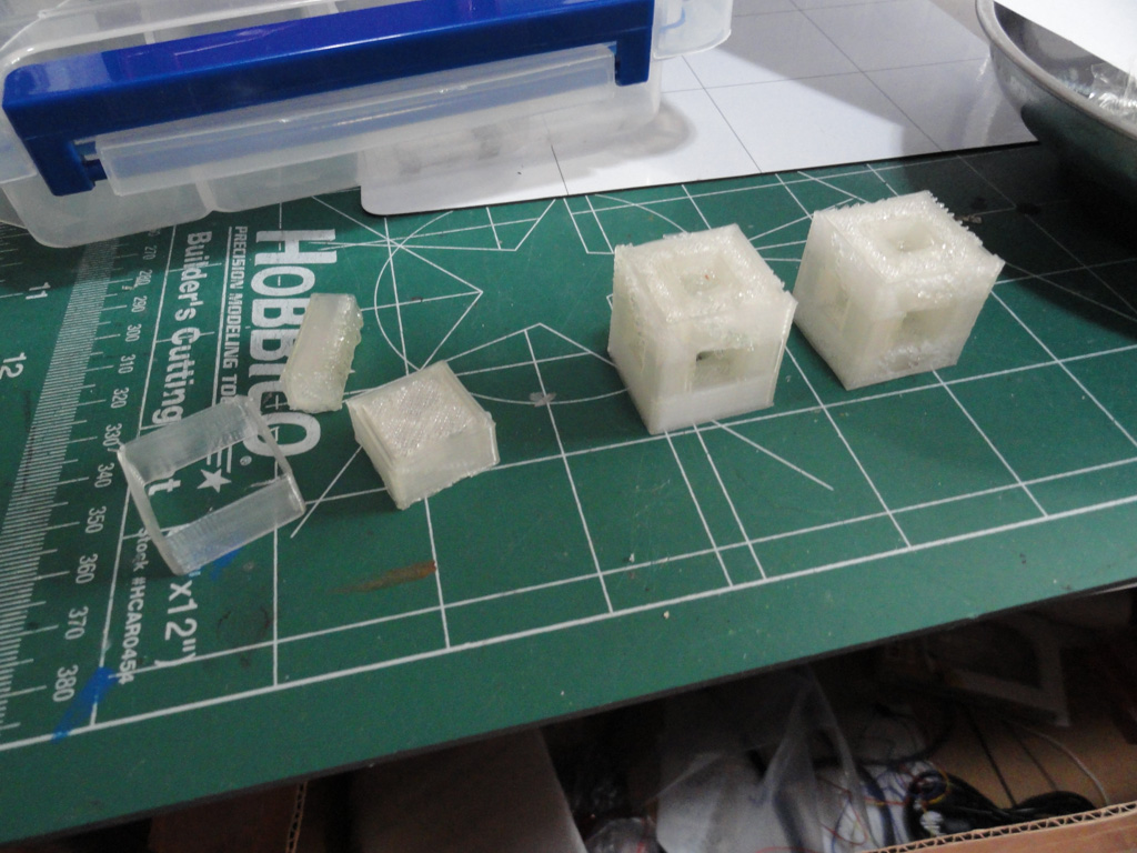 I completed my machine Friday after I bought it at the Maker Faire Detroit. I have it working pretty well so far. I've just run into a couple problems with bad leaking of PLA around where the nozzle goes into the block. I'm running ABS through it now, having seen that suggestion some other places. It's not leaking so far as I watch it print. Are there any suggestions for plugging that up? I've also run into the problem with the power supply cutting out, I've already sent an email on that. I definitely have more tuning to do, but so far I am extremely happy with the results and I'm looking forward to having a much larger print area than my old Thing-O-Matic. As you can see, I still have a lot of cleaning up to do.
