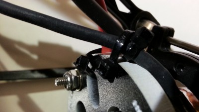 I think this happens way to often. I feel very strongly that for such an easy fix/assembly step, it causes many vociferous outbreaks and random throwing of objects. If you haven't done it-do it-do it now. Provide strain relief for the wires! I, also in my haste to get this thing printing, did not do this. I was lucky, my thermistor pulled part way out. I noticed a temp change and was able to push it back in and zip tie it during a print. And believe you-me there was plenty of vociferous outbreaking!! The High Temp RTV silicone we use to hold it in-will not! High temp epoxy probably would but changing it out would be problematic. I have since zip tied not only the thermistor wire to the mount, but also all the wires that may get tugged on when the effector gets out to the edge of the bed.