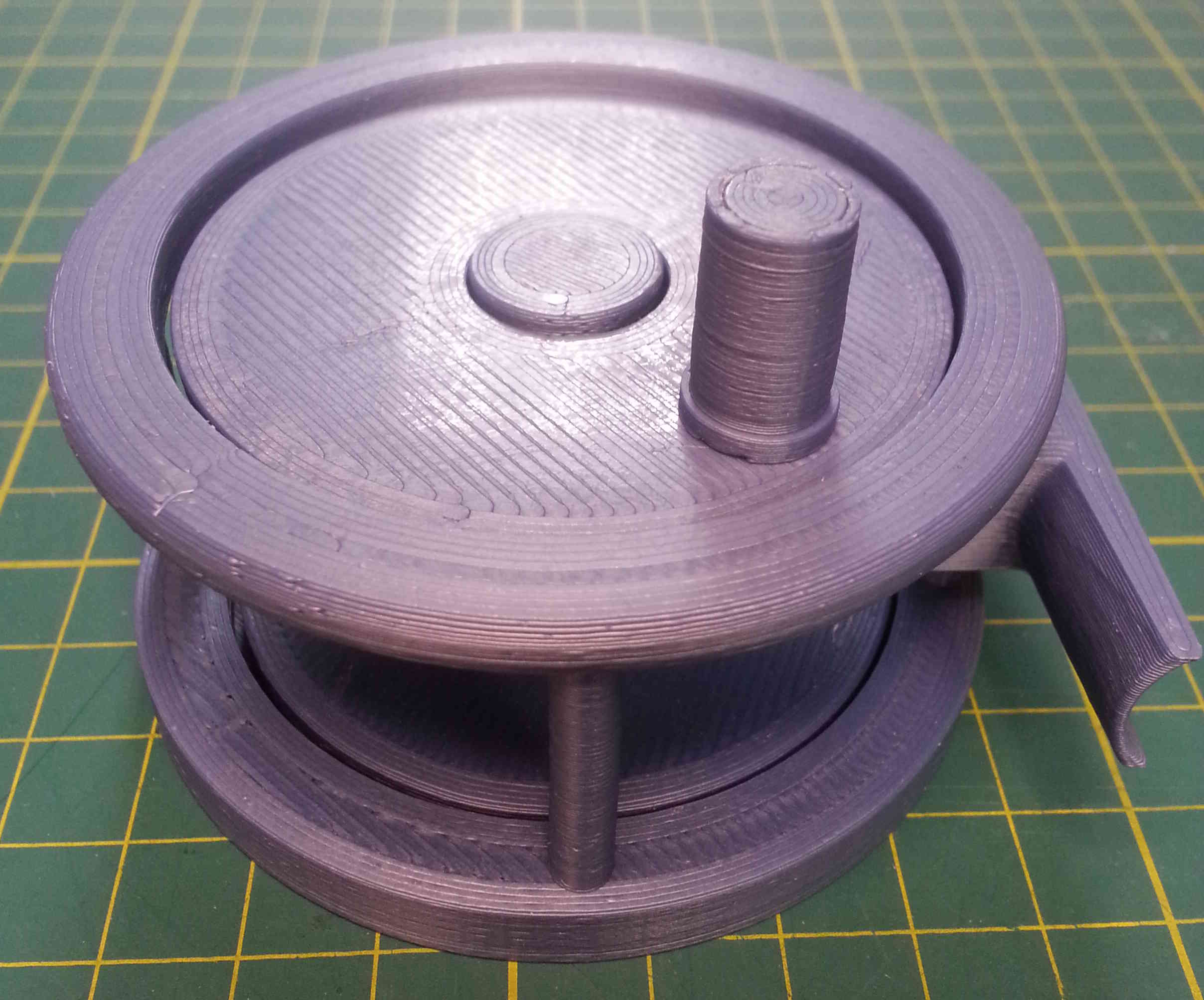 I've been working on this project for about a year. The goal: Print a working fly reel with no other hardware requirements. Originally, I was trying to not have to use glue either but now that I've made a number of prototypes, I think glue is necessary to get the strength needed and it isn't that big of a hassle. Here are some photos of the three part frame and foot assembly