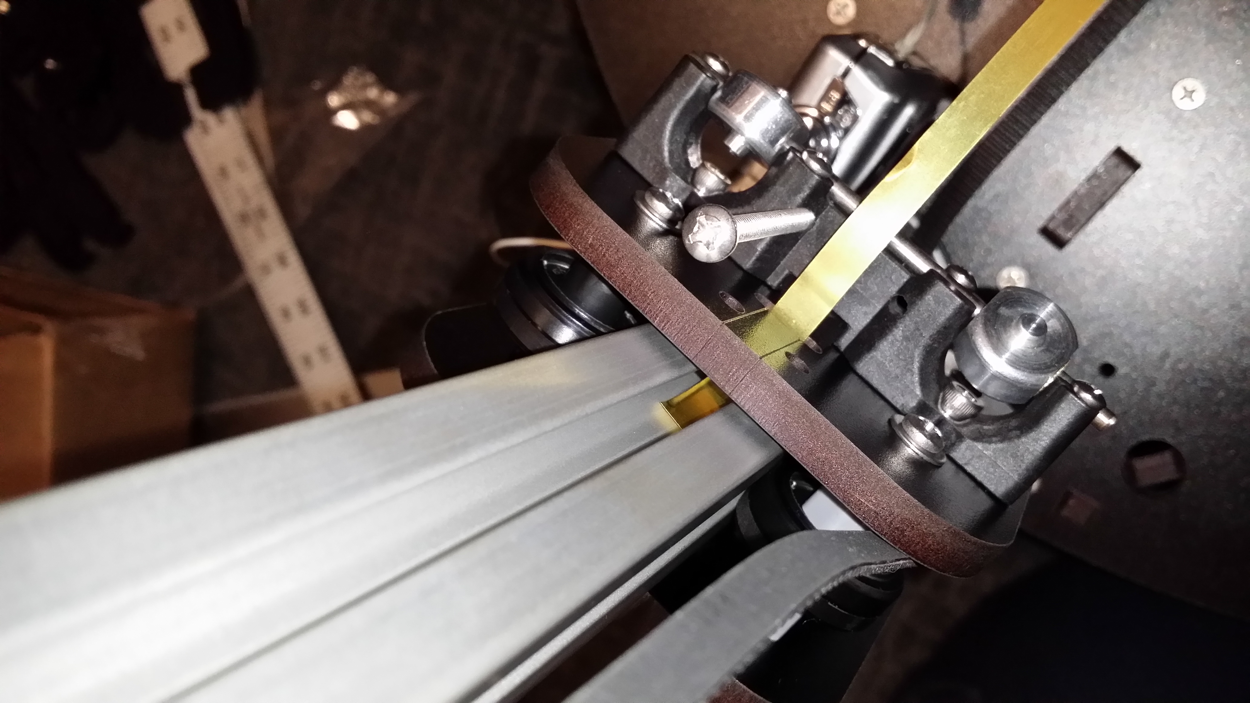 Next I fired on the belts. This was incredibly easy. Popping it down to the axis steppers, the belt naturally fell in front of the lower bearing and I was simply able to grab the belt by hand. No forceps needed. I don't have very sausage-like fingers either though, so for some people, getting those forceps would still be a good choice. I used Dan Barrans method of getting the belts onto the cheapskates and it worked like a charm. Just cut a strip of brass from one of those sheets I got. Some slid right in while the others stuck to the brass and I was able to simply pull them through.