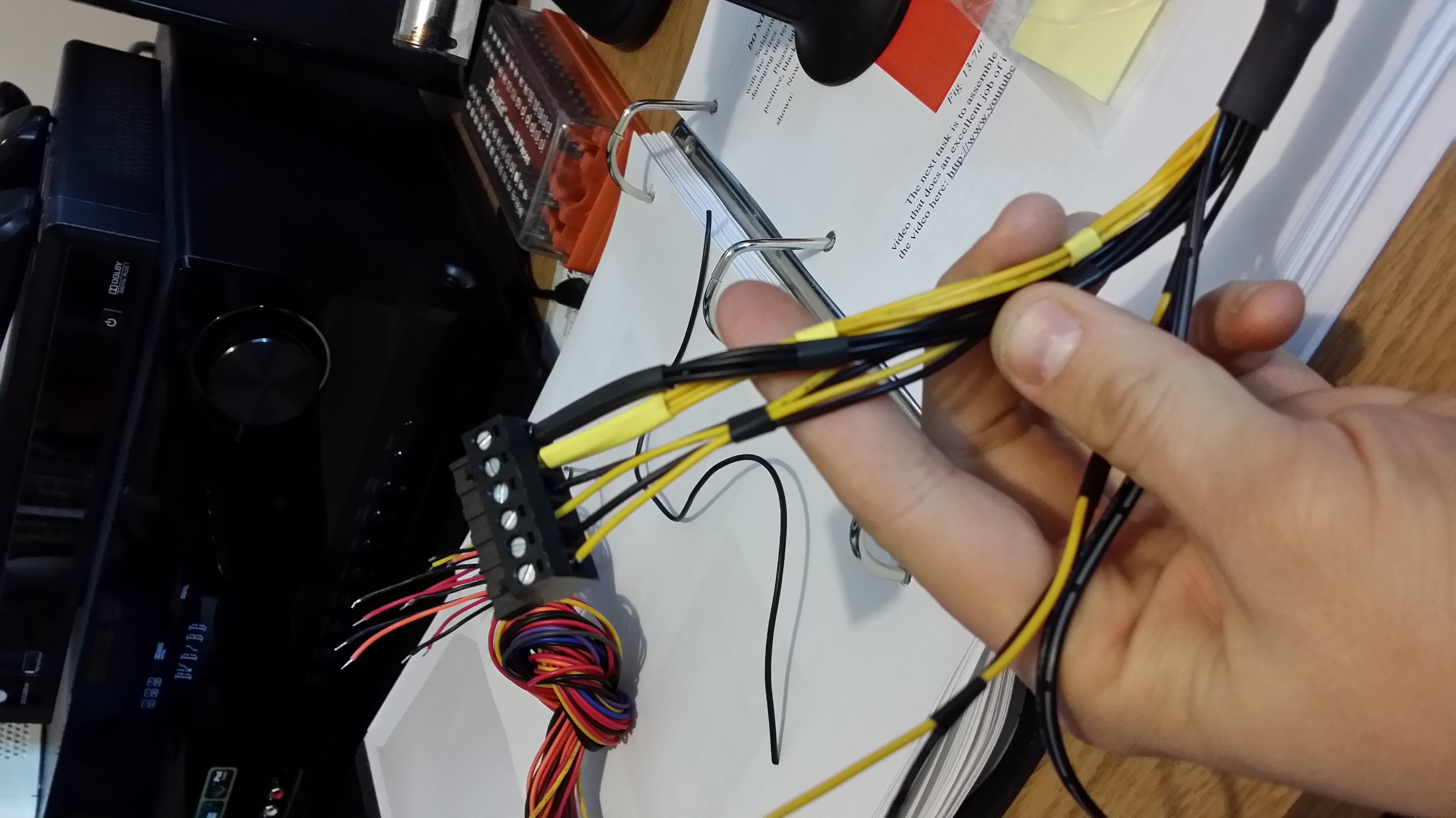Instead of moving the unused 12V, 5V, 3.3V and GND wires aside, I figured nuts to that and took those things right out. I also left a couple more 12V and GND wires for future accessories. I also removed the green power wire and instead took an old unused wall wart and stole the cable off that. Tied one wire into the existing green hole and the other into GND. Now I had almost 6 feet to do whatever I want and didn't need to put in any splices.