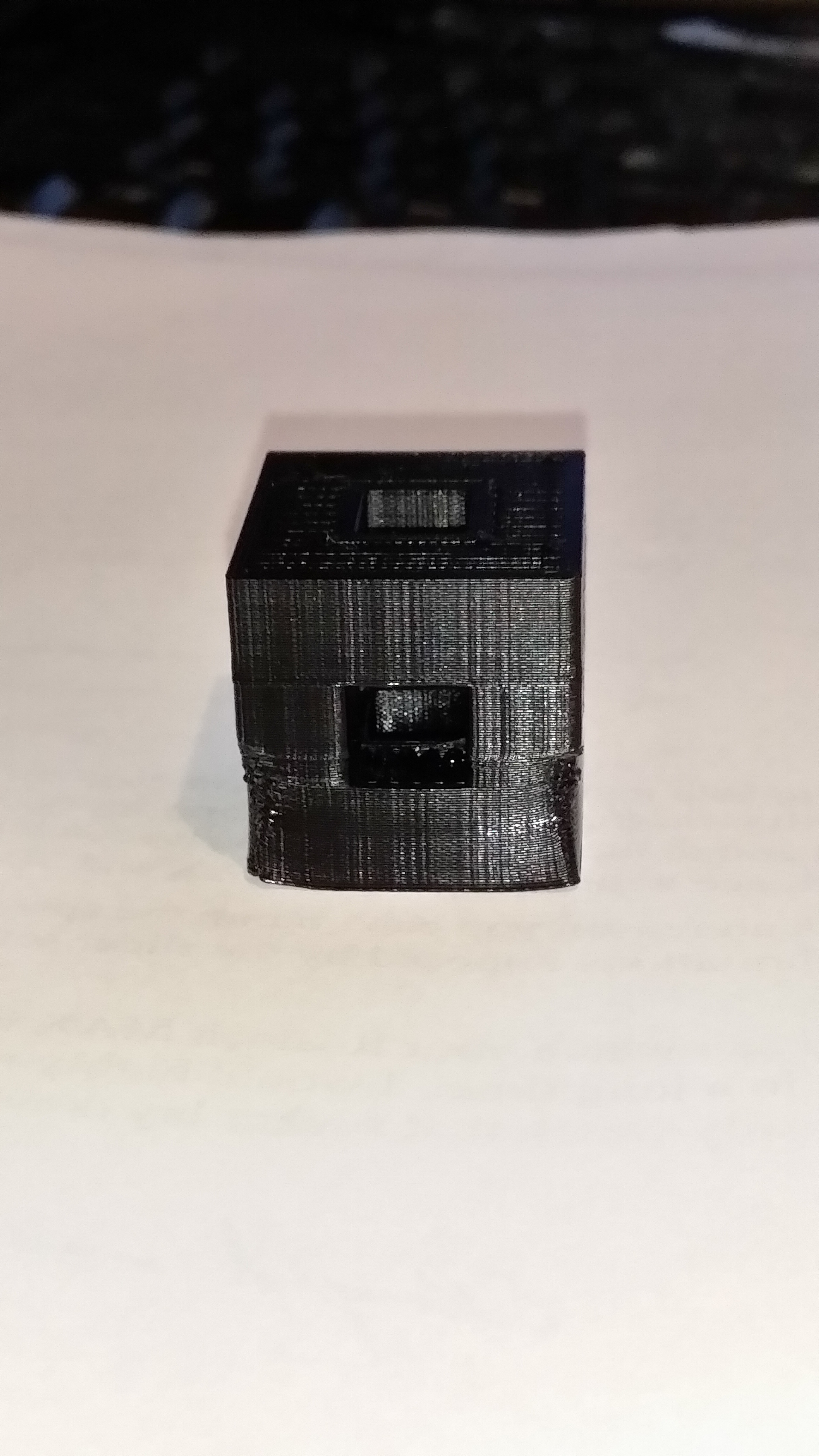 The following is my first print (so cool to see the machine run). The corners were visibly lifting and I could see the extruder squishing the layers under the corners. It was still hot and wet. I then remembered that I should be cooling the part and that's when I just put a regular house fan by it to gently blow air across the piece. This was done just about at half way and you can visibly see exactly when I put the fan on it. This was removed from the blue tape (it came off easily. Later on I realized that what I thought was "stuck" to the bed... was indeed NOT stuck to the bed. I'm surprised it stayed on at all.) There was no cleaning done to the cube.