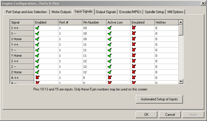 You do have your enable pin settings on the Output tab set properly though. Can you post a screenshot of the general configuration screen. If this configuration is verified and does not work, then you may have a bad parallel port or bad cable.