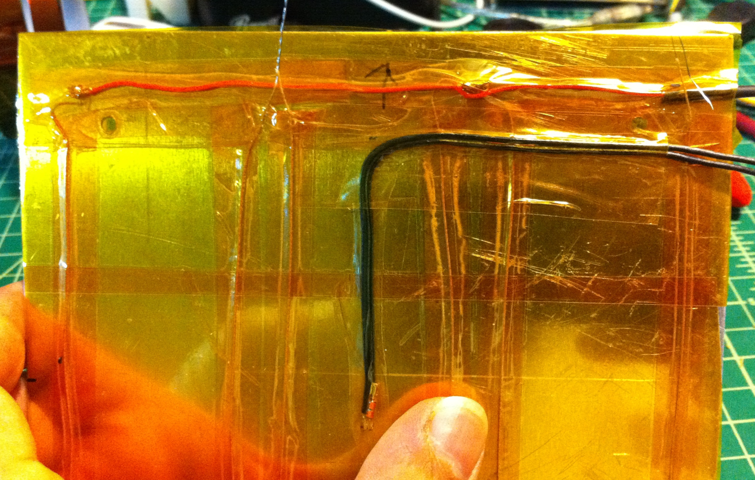 Note: At this point I taped ALL of the sheet with kapton tape, this is optional, but assures me that everything is insulated well - Make a cut out/recess for your thermistor and leads in your 1/8" birch plywood (see picture for details)