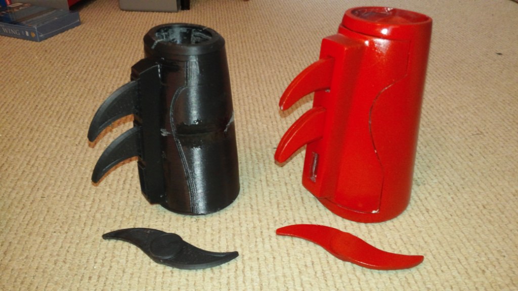 My main reason for getting my Rostock was for costuming props, so here's another costuming prop I've been working on, which is the bracer for my Batwoman costume, the black one on the left obviously is the 3d printed one, the red one on the right is my original hand laid fiberglass one. The old was was a bit too bulky in the way it fit and it didn't fit well so I decided to print up new ones in 3d.
