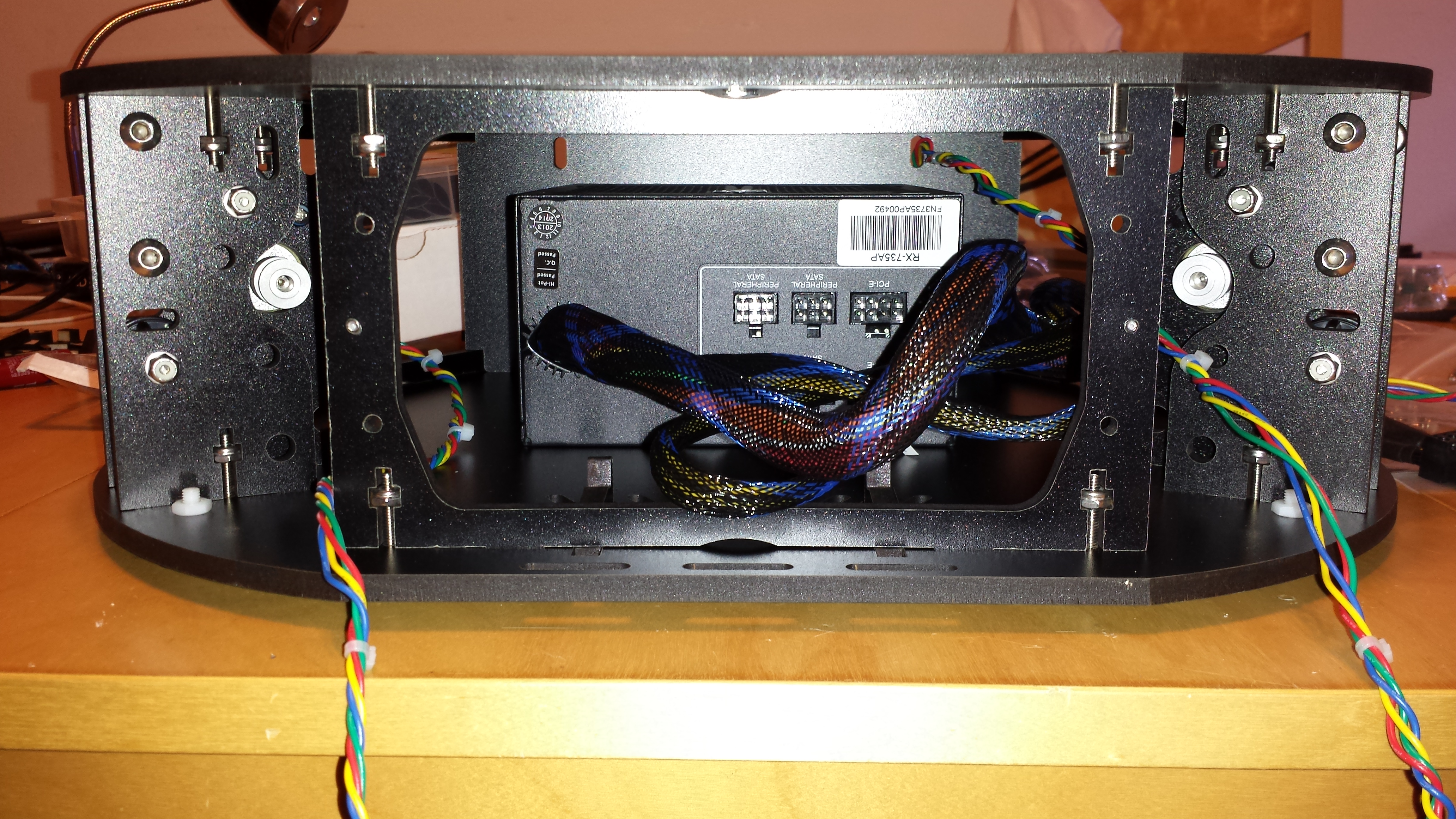 http://www.amazon.com/gp/product/B0014W ... UTF8&psc=1) was fitted to the hole with the grill turned in and bolted. This was then connected to a 5VDC tap on the modular power supply. The fans start with the main power switch and are silent, no motor or wind sounds.
