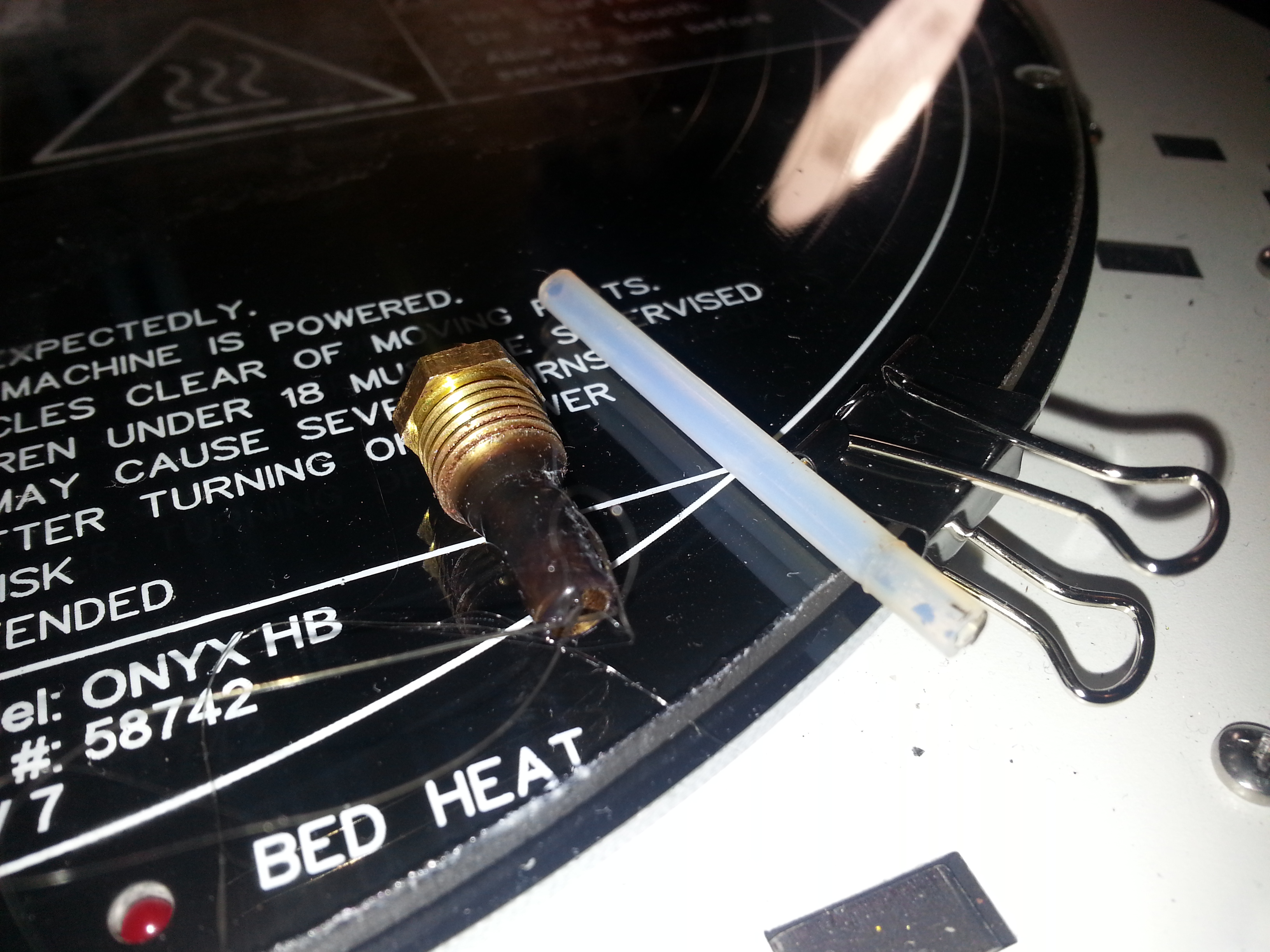 Mac, here's a pic of the PTFE tube. It's still in really good shape but it did leak the nylon internally... too much pressure I guess. Perhaps have to turn down the feed rate for Nylon. Oh yah, I almost forgot, I am running the 0.35mm nozzle for this print as well...