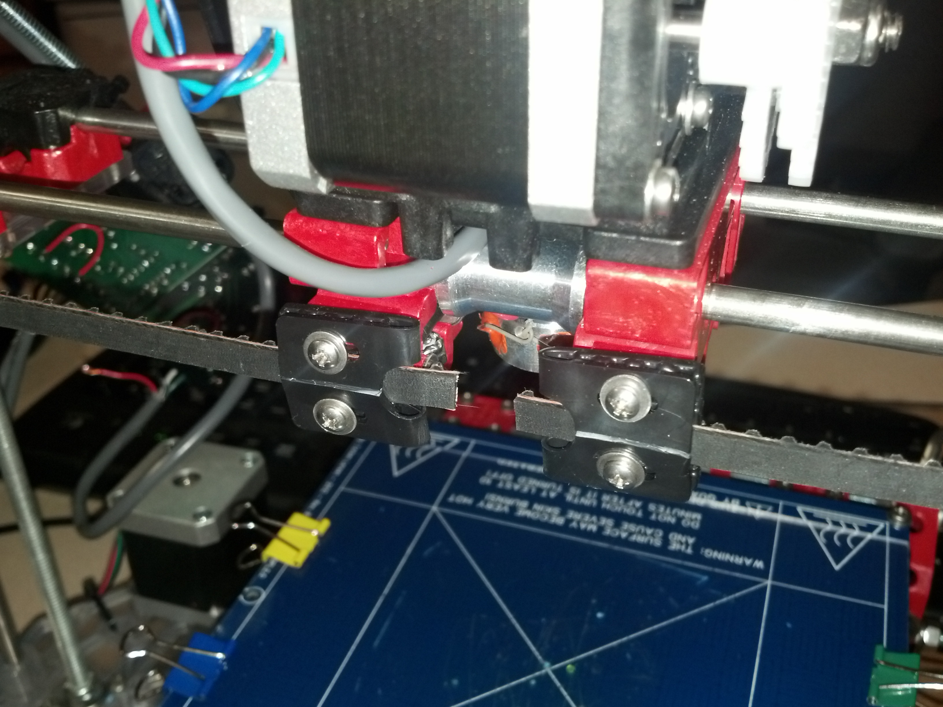 If you're like me, tho, you may have to redo it after a bit. Mine worked great till I had a bit of time on the machine, and the belt stretched or the idlers broke in or something, and the belt got a little loose. I just poked another hole in the belt and put the screw back in. Bing, bang, boom, good as new! Eventually I used a small hose clamp, straightened it out, and put it inline on one side. Now it's a simple screw adjustment to adjust the belt, if I ever have too....