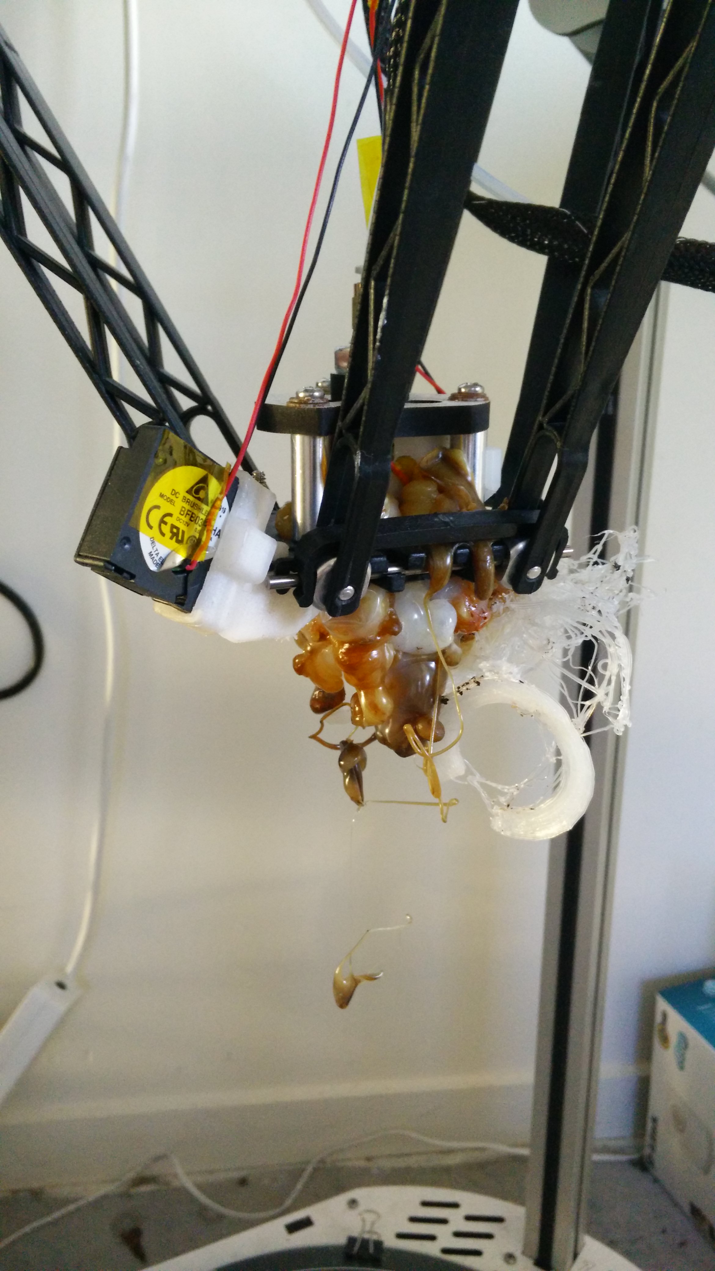 Not only did it come unstuck, the nylon somehow forced itself up backwards all through every nook and cranny (even into the fans) of the head. Given the melting point of the nylon is no doubt higher than the melting point of the black plastic (ABS?) Rostock use (or the wiring..) Im thinking this is not recoverable at all?