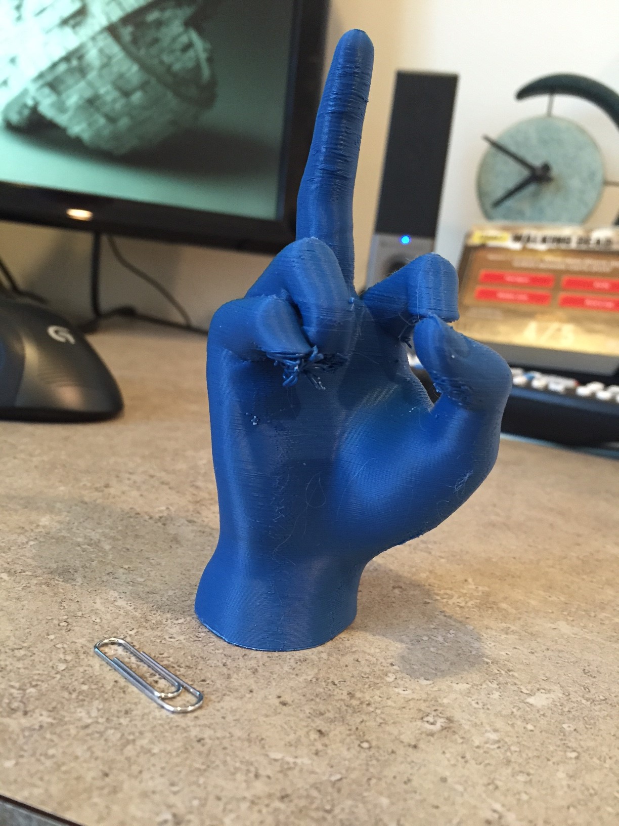 I did this in Cura 14.09 and obviously some settings were off. Even though I had 'support' turned on, it still was trying to print over thin air for the tips of the fingers. Ugh. Looks like Ver 15.02.1 puts more support in. So I might try again.