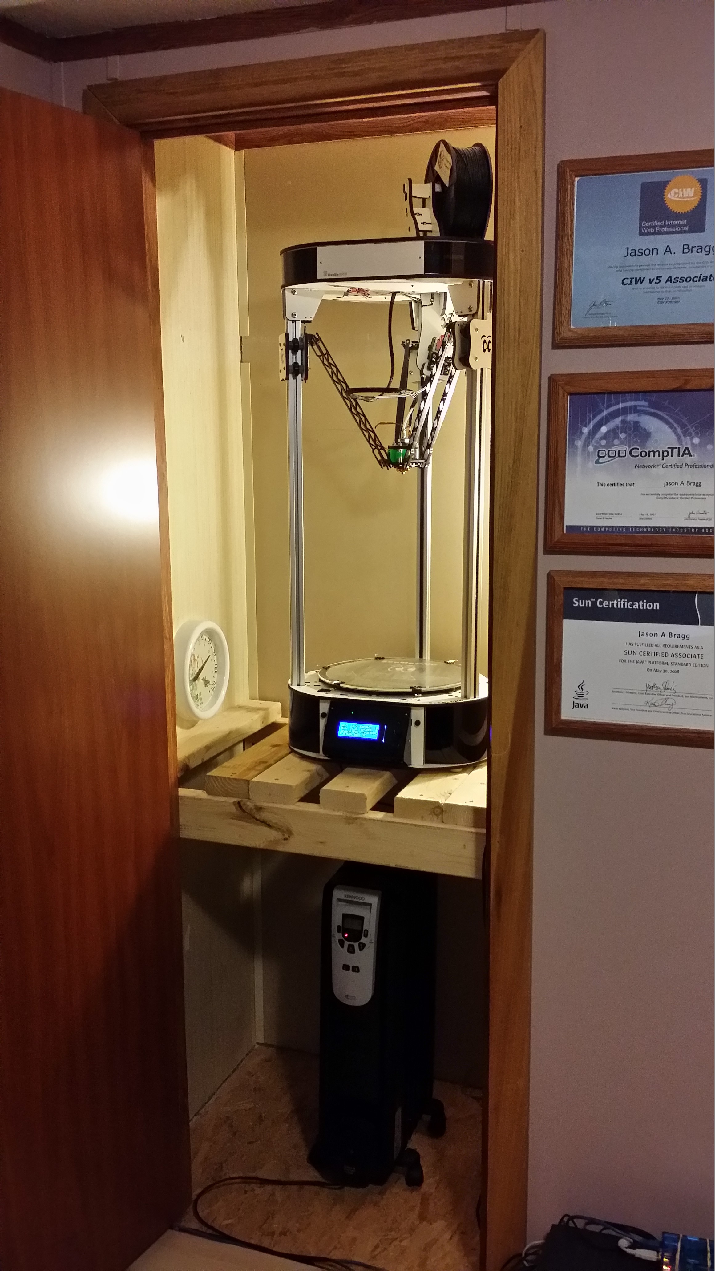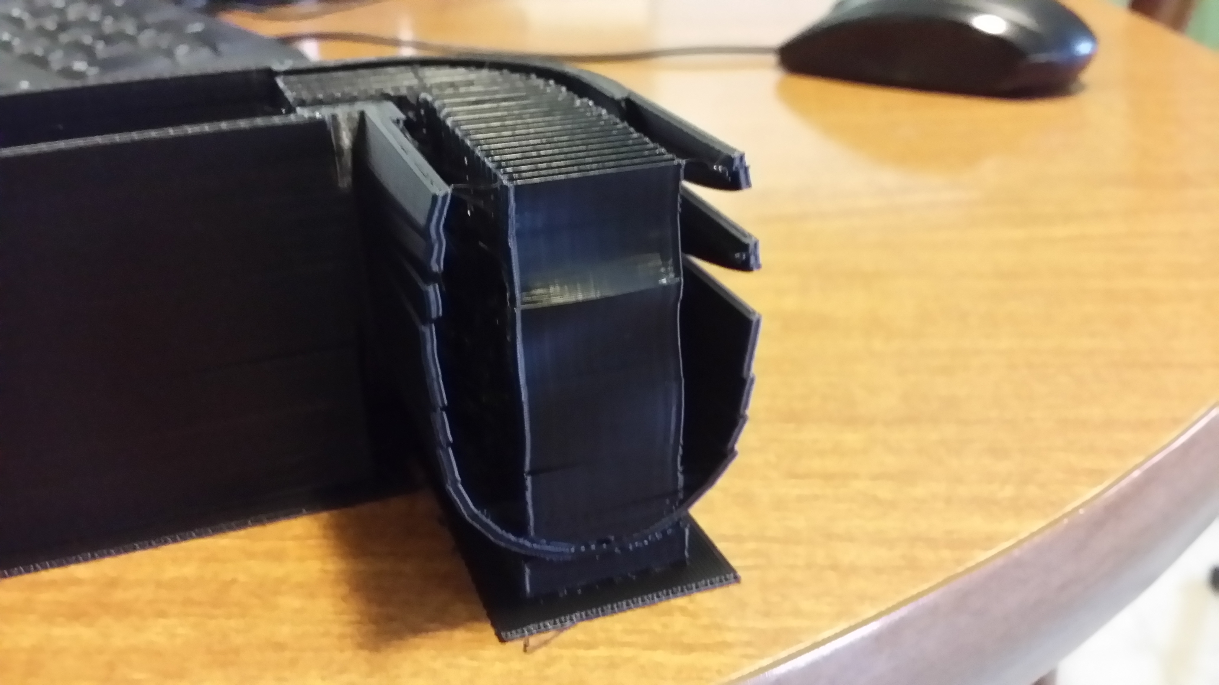I'm a new Rostock Max v2 owner and so far I've done a few small ABS prints with no troubles so I decided to start one of my larger prints. These are parts for a car mod that I'm doing. Well I got major delamination. What do you guys think might cause this, or help it rather? I was printing at 225c nozzle / 90c bed. I do not have an enclosure around my printer but other folks tell me they can print ABS "OK" without an enclosure. Ambient room temp is in the mid-70's with no breezes or anything. I sliced the part with the Cura slicer that's built in to Repetier Host, using a config file that I got here from the forums. I checked and the Cura config was about the same as the Rostock Max MatterControl config that you can download from SeeMeCNC. So I'm open to suggestions!?