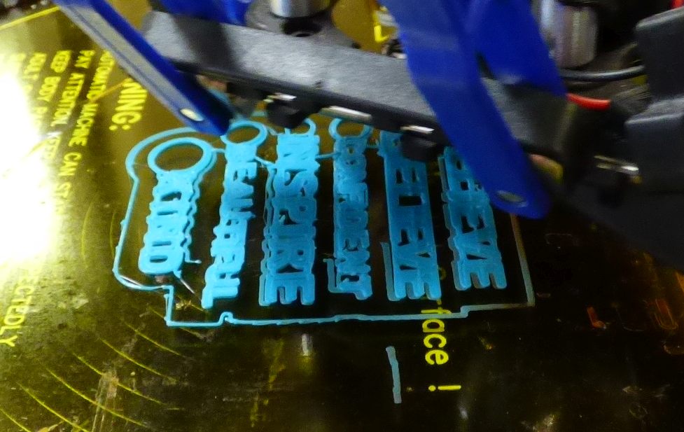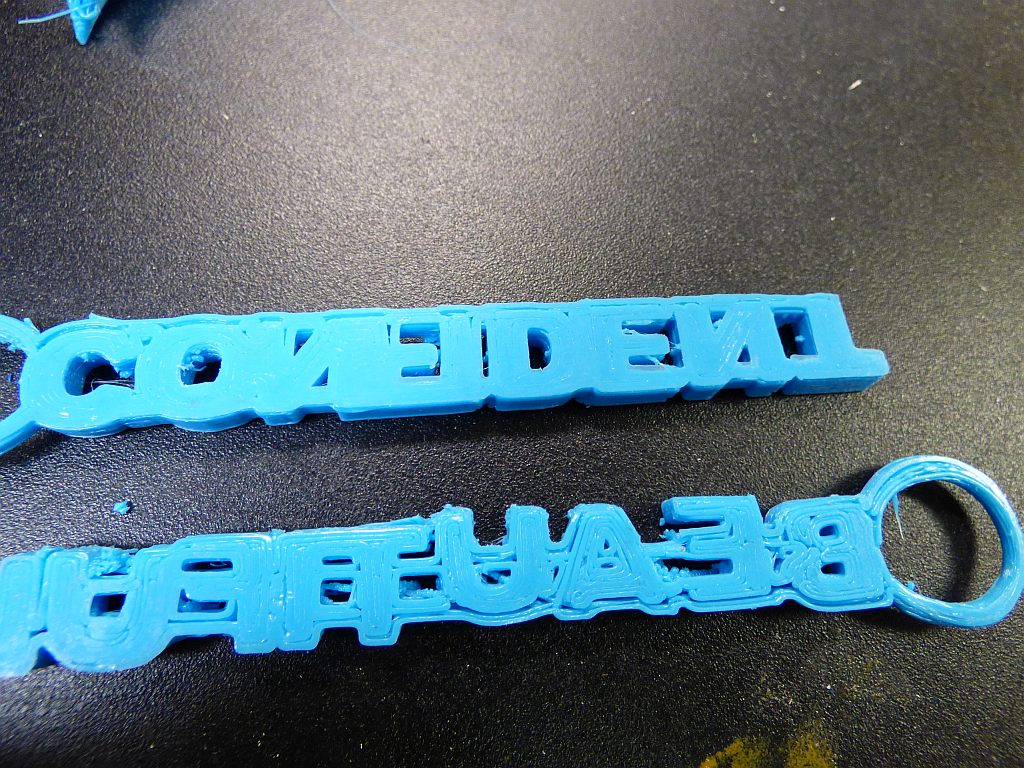 The second problem can be seen in the photo of the bottom of the print of the word "BEAUTIFUL." We get this a lot and have for quite some time now. There does not seem to be good bonding between rows of filament laid down on the first layer. This is exacerbated when on the inside of a large-radius curve. It seems as if the outside shell is shrinking before the next strand has a chance to bond with it, leaving a gap. There are often gaps in the filament on the first layer and these then are repeated in subsequent layers.