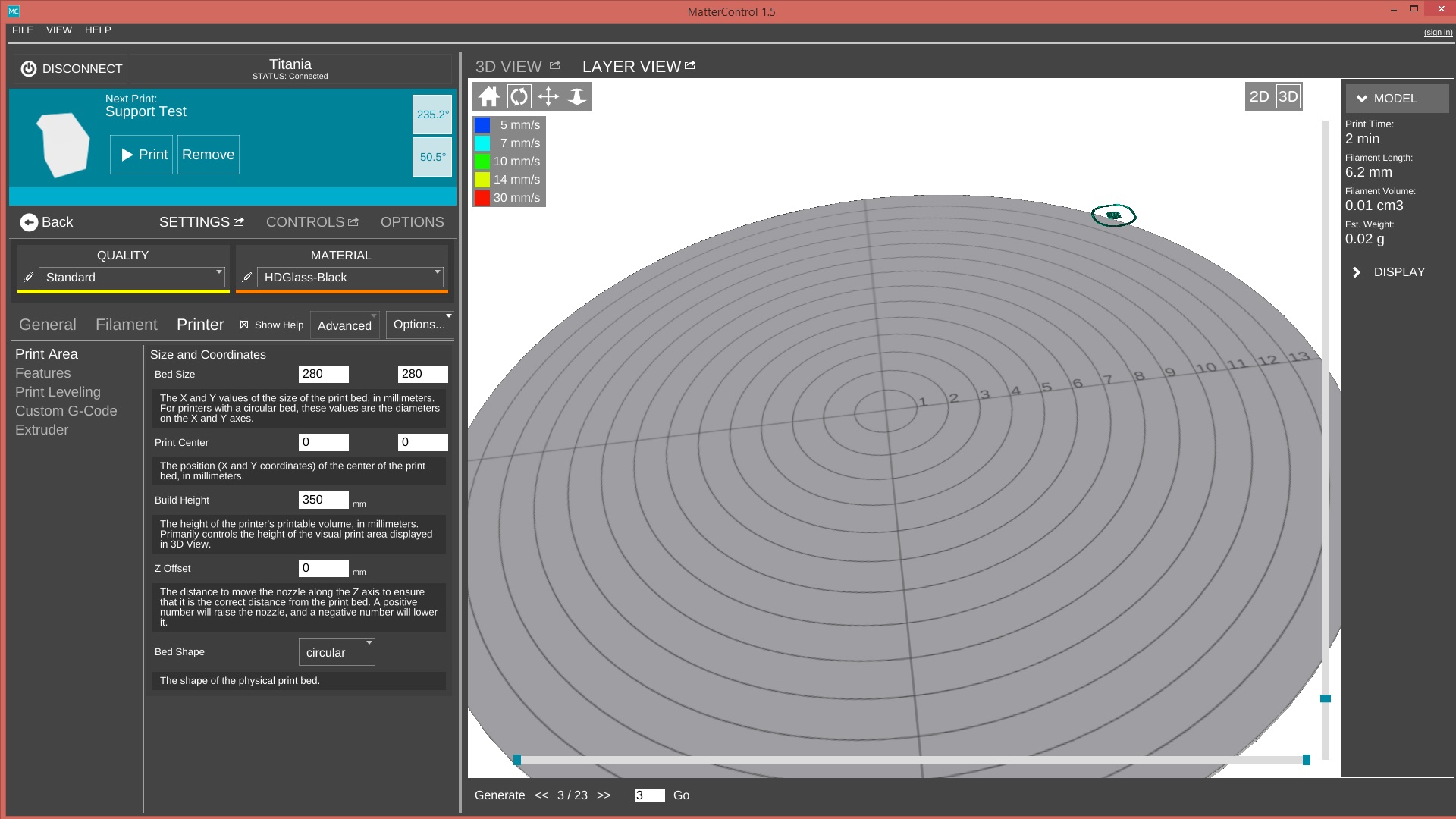 I just installed MatterControl 1.5, loaded a small test object and immediately ran into some strange behaviour. The object was correctly placed at 0,0 on a circular bed but after slicing it was moved off the edge of the bed. As well, in 2D Layer View the sliced object was placed far from the center and on a rectangular bed.